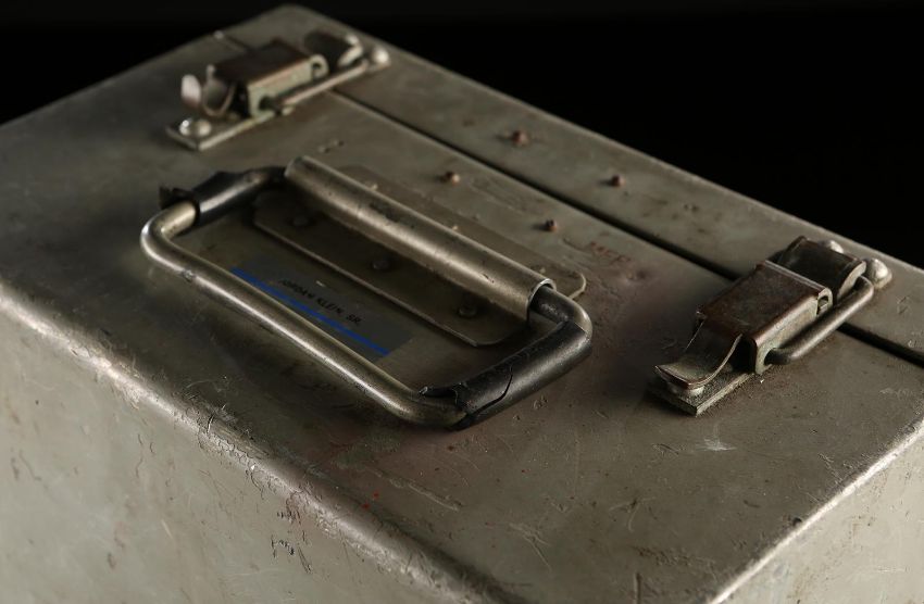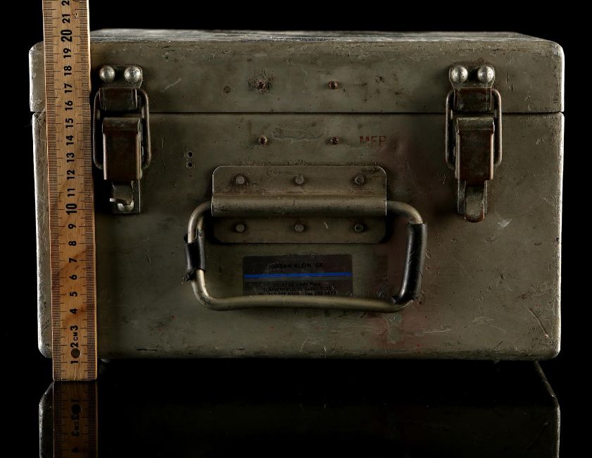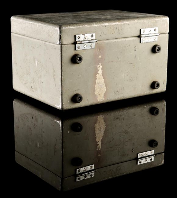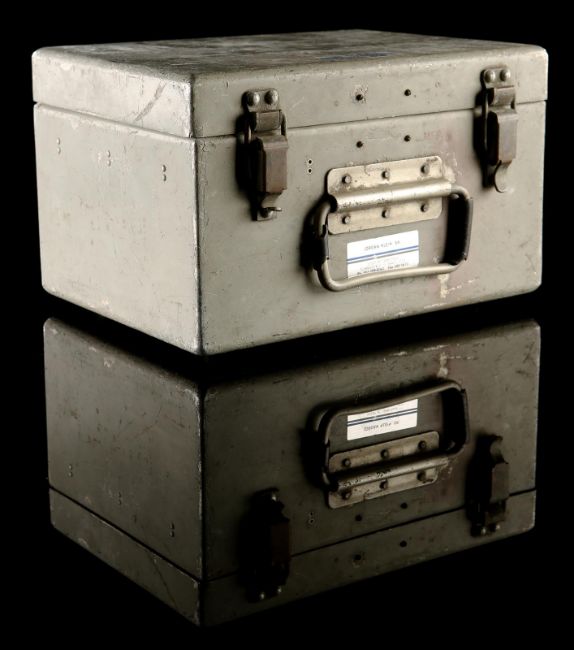 The bomb fuse box from Terence Young's spy thriller Thunderball. After bringing down a NATO aircraft, Emilio Largo (Adolfo Celi) stole two nuclear warheads and a bomb fuse box during an underwater attack. The box is made of aluminium and includes two locking clasps and a metal grip at the front. Both the back and the bottom of the lock box are outfitted with four rubber feet. Address labels were applied to the box lid and top after filming by underwater engineer Jordan Klein. The piece shows some wear due to production use and age, with scratches to the metal case and breaks in the rubber handle wrapping, however overall it remains in good condition. Dimensions: 25 cm x 30 cm x 20 cm (10" x 12" x 8") VAT Status - OMEGA
