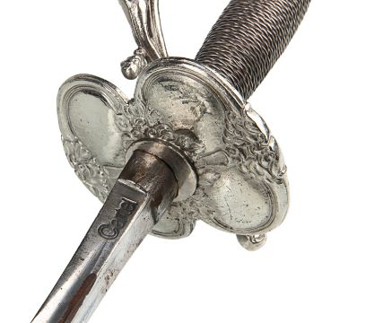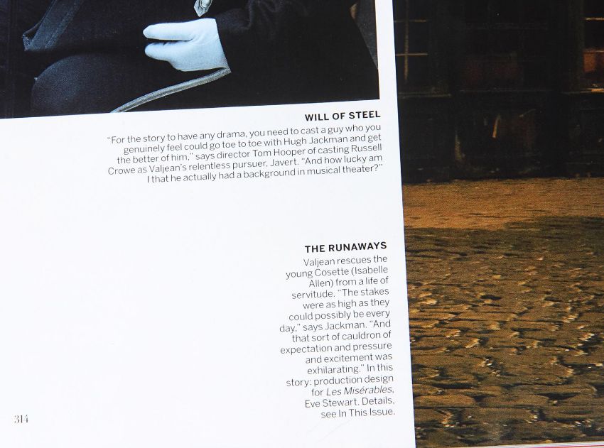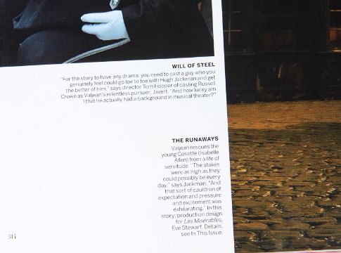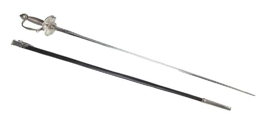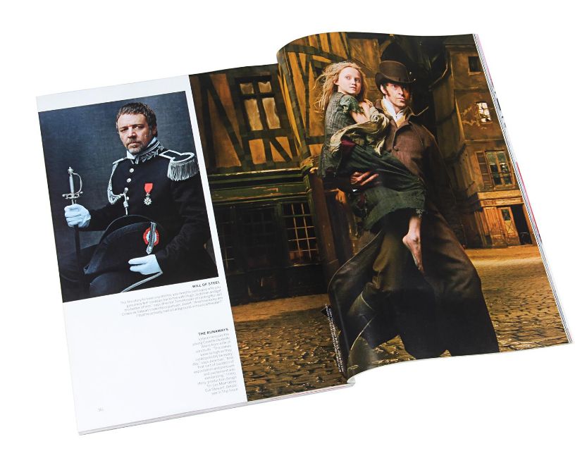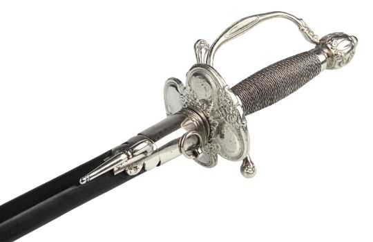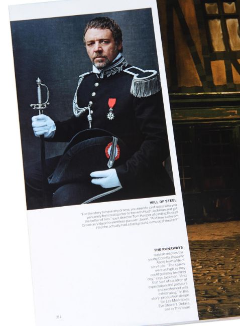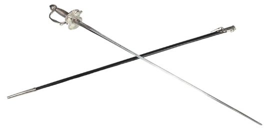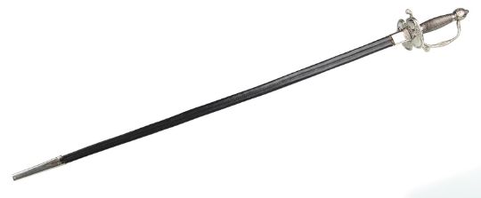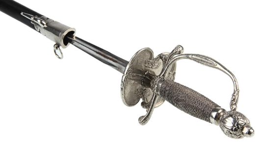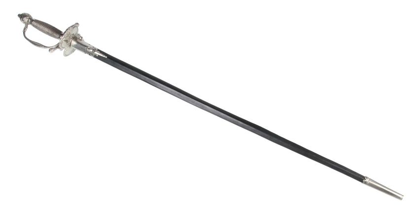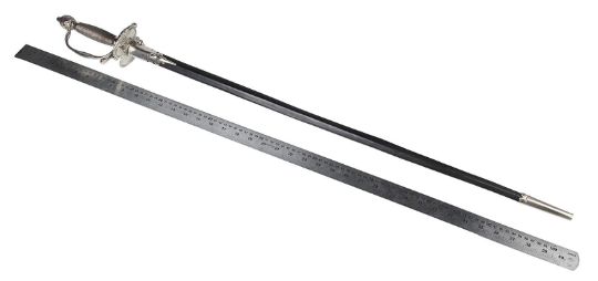 Inspector Javert’s (Russell Crowe) fencing foil from Tom Hooper’s Academy Award®-winning musical drama Les Misérables. Javert’s weapon of choice was a rapier, as he hunted down Jean Valjean(Hugh Jackman). This ornate sword features a wire lattice pattern on the grip, with an elegant repeating floral pattern running over its pommel and guard. The blade is triangular in profile and made from lightweight aluminium, the edges of which have been softened to ensure the actors’ safety. The word 'Cartel' is stamped at the blade’s base. The scabbard is black leather, with polished metal capping at each end. The sword is accompanied by a copy of the December 2012 issue of US Vogue magazine featuring an image of Javert with his sword as part of the Les Misérables article. The sword displays some minor wear to the blade and scabbard from use. Dimensions (sheathed): 100 cm x9 cm x 7 cm (39 ½" x 3 ½" x 2 ¾") VAT Status - Margin