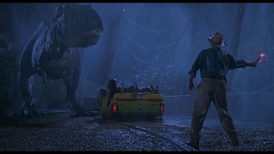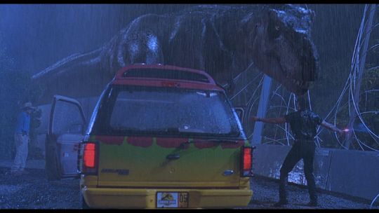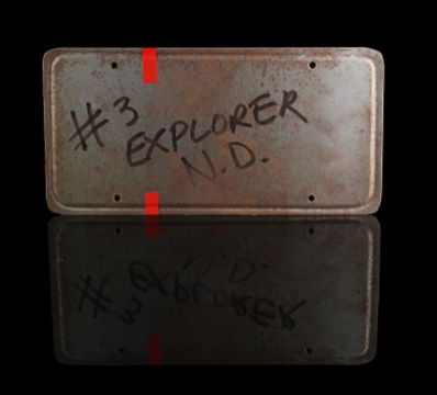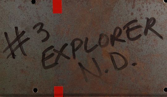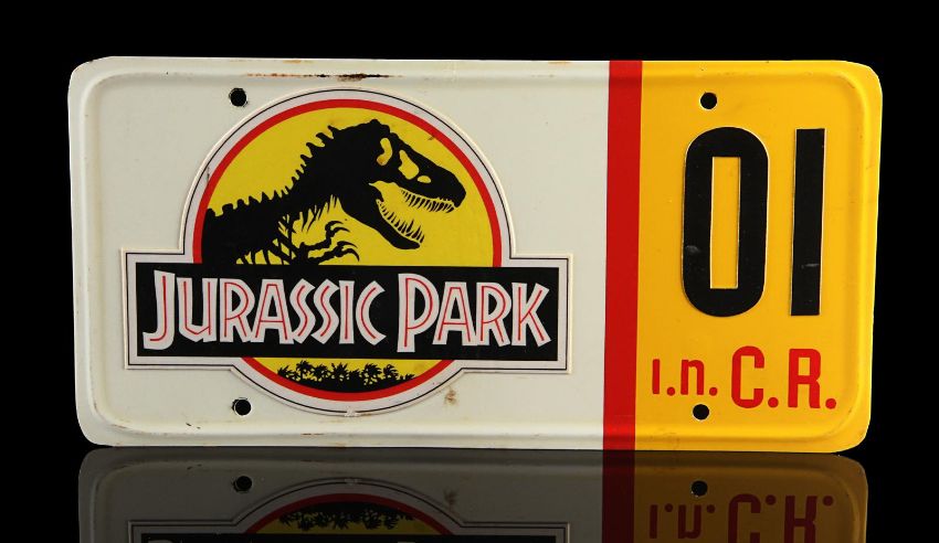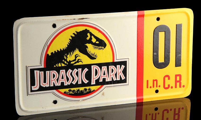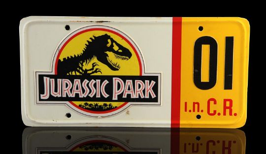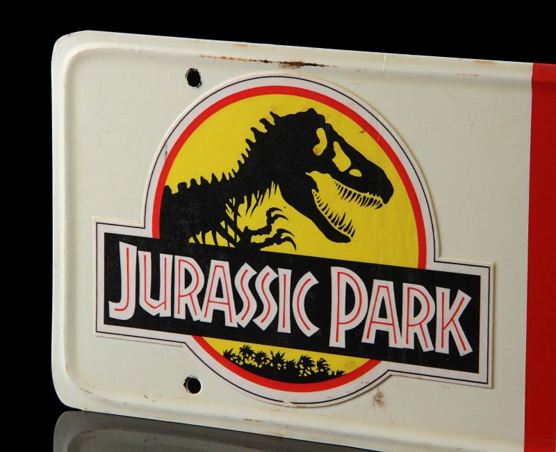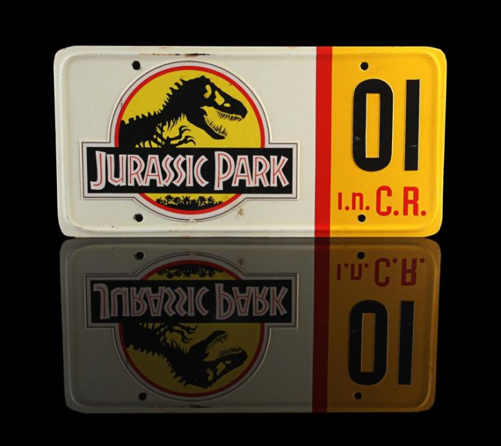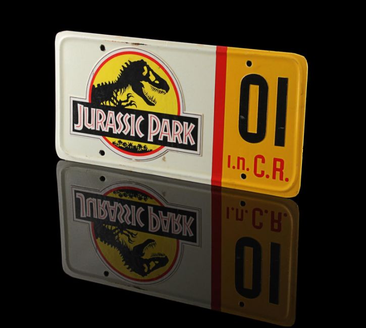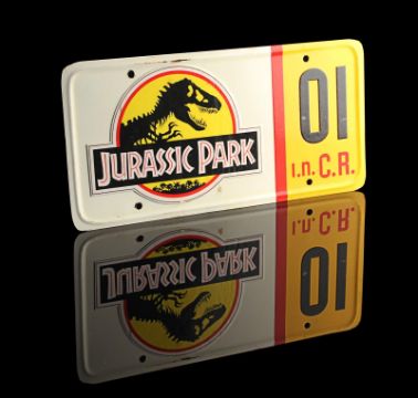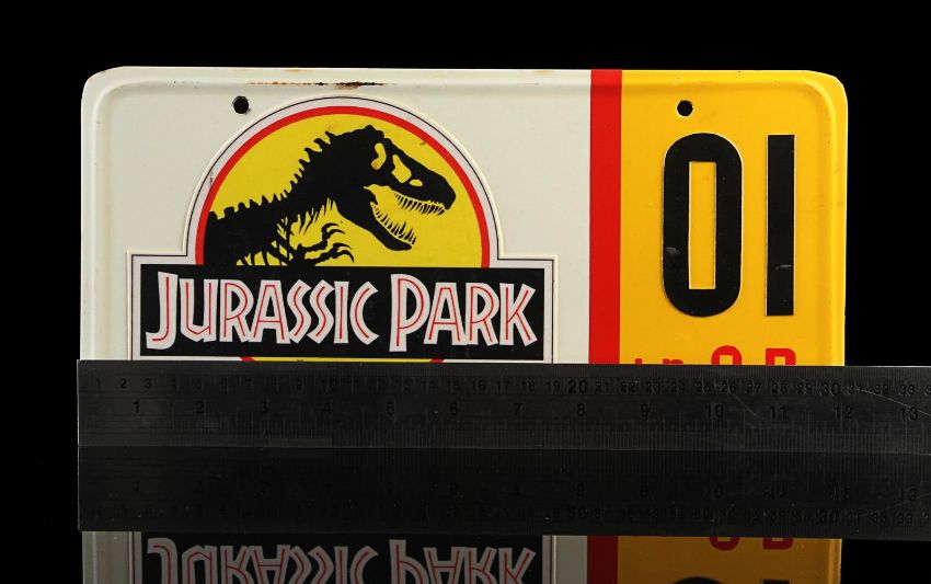 A Ford Explorer licence plate from Steven Spielberg’s Oscar®-winning action-adventure Jurassic Park. Ford Explorer vehicles were most memorably used in the scenes in which Dr. Alan Grant (Sam Neill) and Dr. Ian Malcolm (Jeff Goldblum) encounter the escaped Tyrannosaurus Rex. Made from metal, the licence plate has been painted white and yellow with red lettering. Vinyl appliques featuring the Jurassic Park logo, "01" and a red strip are adhered to the plate’s front. On the back, "#3 Explorer N.D." is written in black marker. It displays some wear including minor corrosion and chipping to the finish and rusting to the metal reverse. Dimensions: 0.5 cm x 30.5 cmx 15 cm ( ¼" x 12" x 6") VAT Status - Margin TRIANGLE