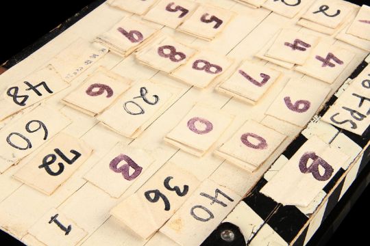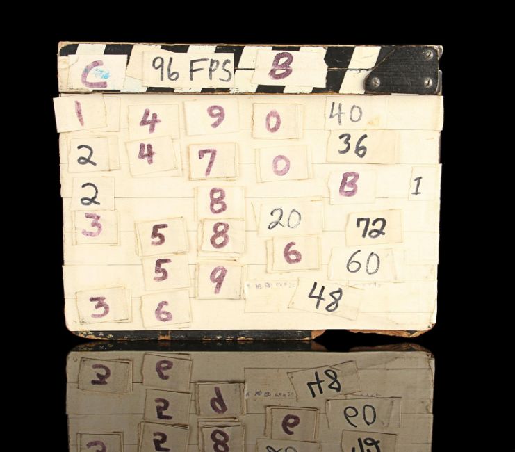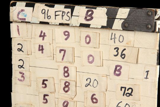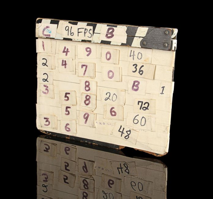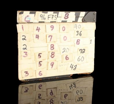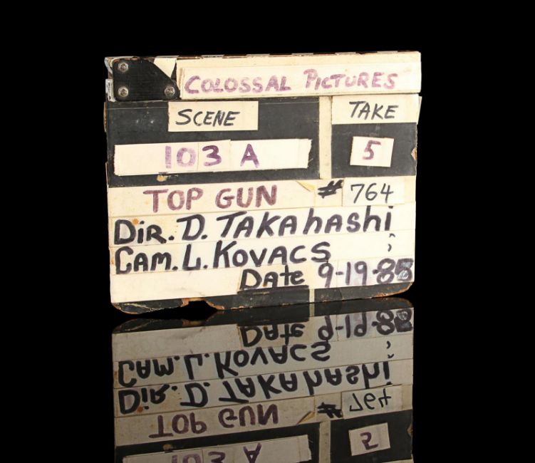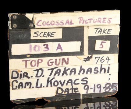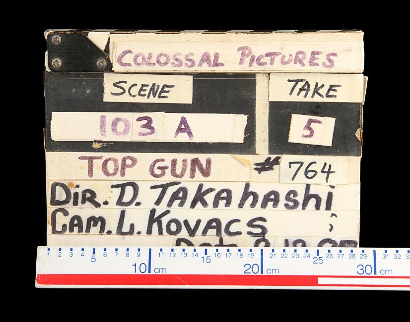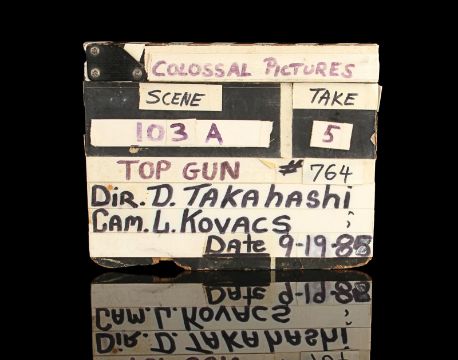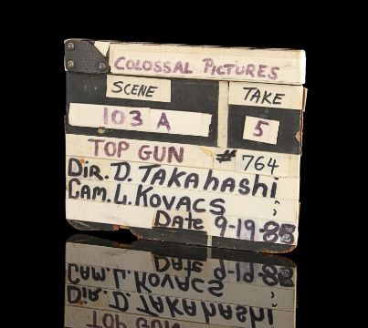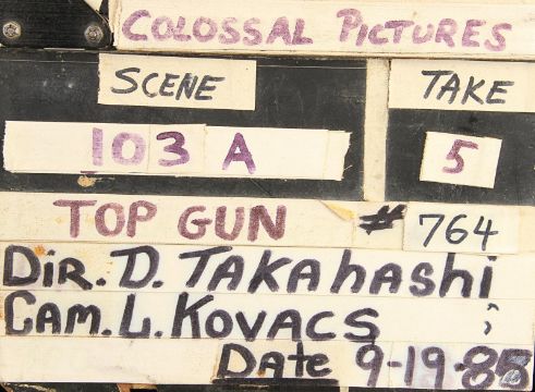 A model unit clapperboard from Tony Scott’s action film Top Gun. The clapperboard was used throughout photography on the film’s visual-effects sequences by the technicians of USFX, and screen matches to behind-the-scenes footage and rushes seen in Danger Zone: The Making of Top Gun.Marked for use by main title producers Colossal Pictures along the clapper’s sticks, the clapperboard is made of wood and features the title 'Top Gun' written in black marker on tape across the centre. The names of Colossal Pictures founder Drew Takahashi and cinematographer Laszlo Kovacs – who were ultimately uncredited for their work on the production –are found below. The date is marked 19 September 1985 in the bottom right. Scenes and takes are marked on tape, with various numbered pieces of interchangable tape applied to the board’s rear. The board has damage along the bottom and the right-hand side of the plate from use on set, which matches up with period footage, with signs of natural production wear throughout. Dimensions: 3.5 cm x 28 cm x 22.5 cm (1 ½" x 11¼" x 9") VAT Status - Margin