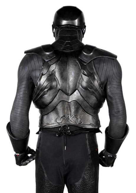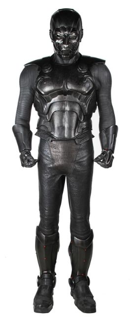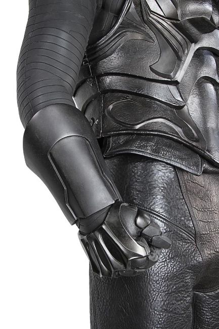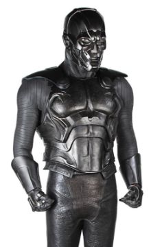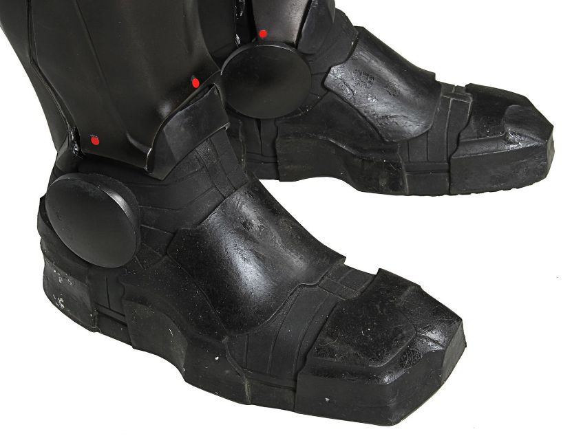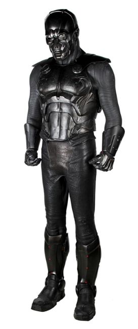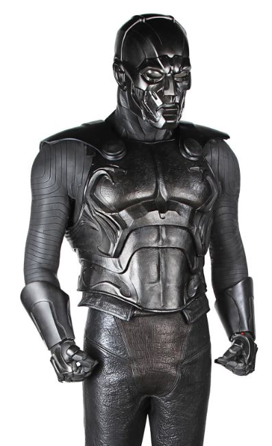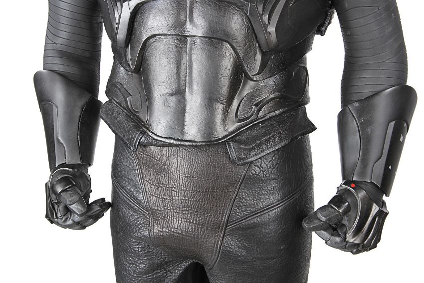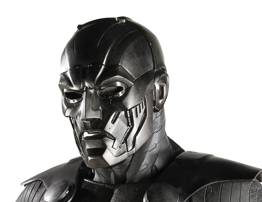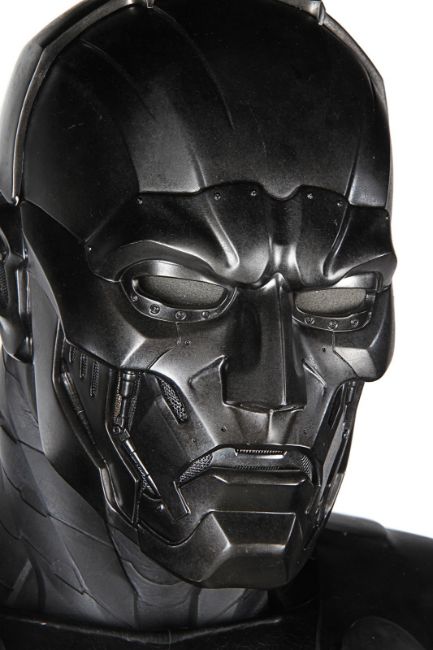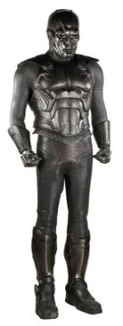 Dr. Doom’s (Julian McMahon) costume from Tim Story’s superhero adventure sequel Fantastic 4: Rise of the Silver Surfer. Victor Von Doom wore his costume throughout the film as he plotted to steal the Silver Surfer’s (Doug Jones) board and gain extra power through cosmic energy. The costume consists of a two-part, full-head mask, body armour and under suit, cowl, sleeves, trousers, gloves, boots, greaves and braces. Each component is fitted with poppers, zips and Velcro to fasten it all together. The head appliance, body armour and greaves are constructed from fibreglass, with a black metallic finish. The cowl and sleeves are made from foam rubber and feature sculptured lines to resemble flexible armour. The boots, gloves and braces are also made from a thick foam rubber and the trousers are black leather. Assorted labels are handwritten on the interior of the components, with the trousers and boots reading 'Julian #2' and the under suit 'Hero #1.' The cowl shows the label 'Stunt #1' and the braces say 'Doom Stunt #2'. The greaves are covered in red dot tracking markers for VFX sequences and have two labels reading 'Julian Hero' and 'Doom #1'. Two wardrobe tags reading ‘Doom Hero #2 Leather Pants Julian’ and ‘Doom Hero #1’ are also included. This ensemble is presented on a custom mannequin display. Signs of wear are evident, including minor chips and tears. Dimensions (displayed): 36 cm x 58 cm x 190 cm (14" x 23" x 75") VAT Status - Margin