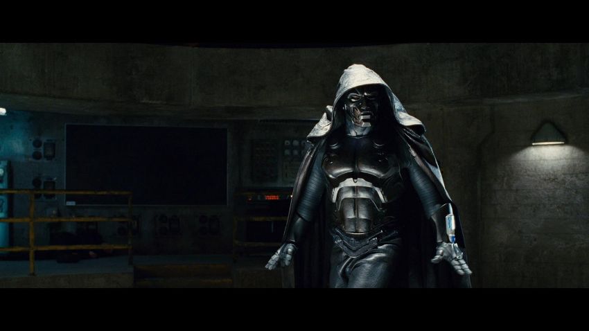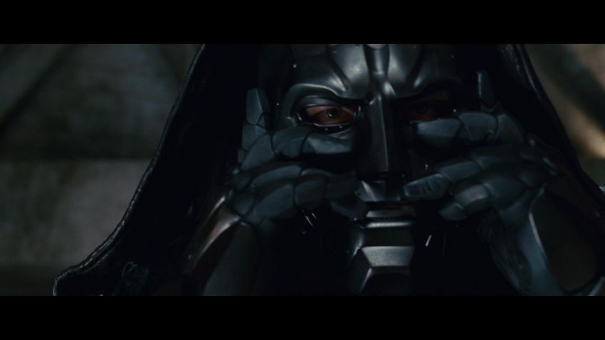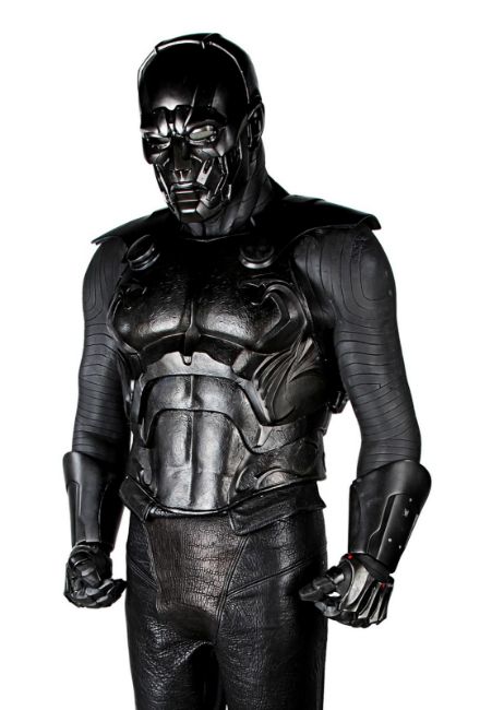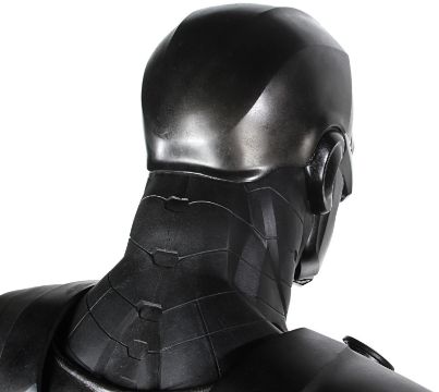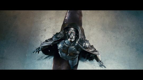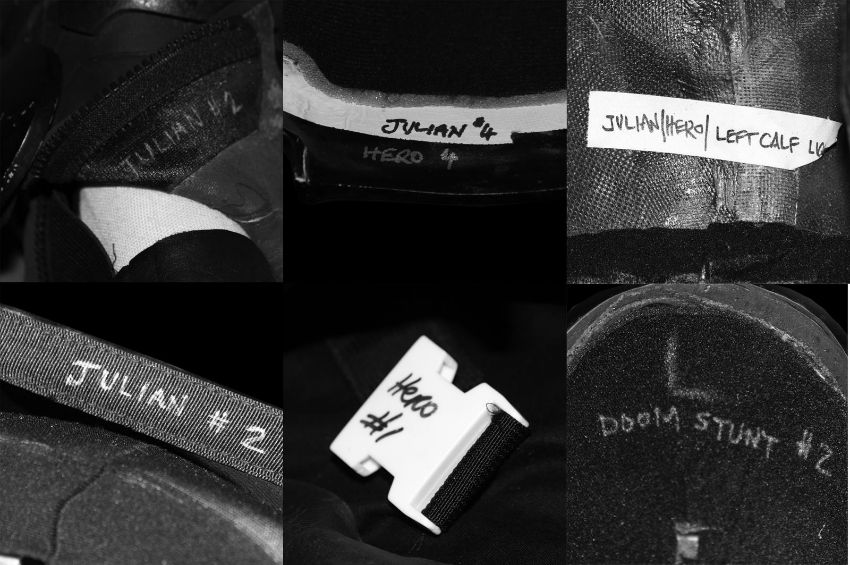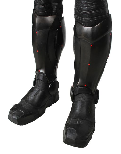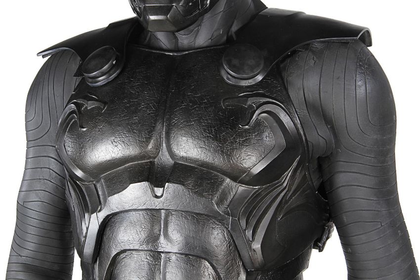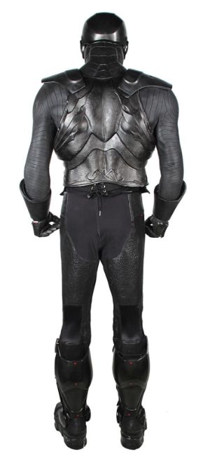 Dr. Doom’s (Julian McMahon) costume from Tim Story’s superhero adventure sequel Fantastic 4: Rise of the Silver Surfer. Victor Von Doom wore his costume throughout the film as he plotted to steal the Silver Surfer’s (Doug Jones) board and gain extra power through cosmic energy. The costume consists of a two-part, full-head mask, body armour and under suit, cowl, sleeves, trousers, gloves, boots, greaves and braces. Each component is fitted with poppers, zips and Velcro to fasten it all together. The head appliance, body armour and greaves are constructed from fibreglass, with a black metallic finish. The cowl and sleeves are made from foam rubber and feature sculptured lines to resemble flexible armour. The boots, gloves and braces are also made from a thick foam rubber and the trousers are black leather. Assorted labels are handwritten on the interior of the components, with the trousers and boots reading 'Julian #2' and the under suit 'Hero #1.' The cowl shows the label 'Stunt #1' and the braces say 'Doom Stunt #2'. The greaves are covered in red dot tracking markers for VFX sequences and have two labels reading 'Julian Hero' and 'Doom #1'. Two wardrobe tags reading ‘Doom Hero #2 Leather Pants Julian’ and ‘Doom Hero #1’ are also included. This ensemble is presented on a custom mannequin display. Signs of wear are evident, including minor chips and tears. Dimensions (displayed): 36 cm x 58 cm x 190 cm (14" x 23" x 75") VAT Status - Margin