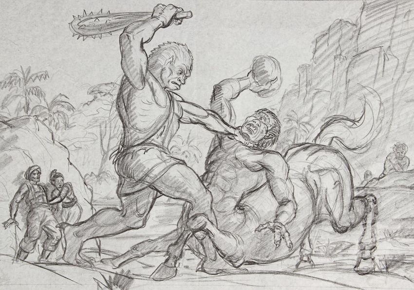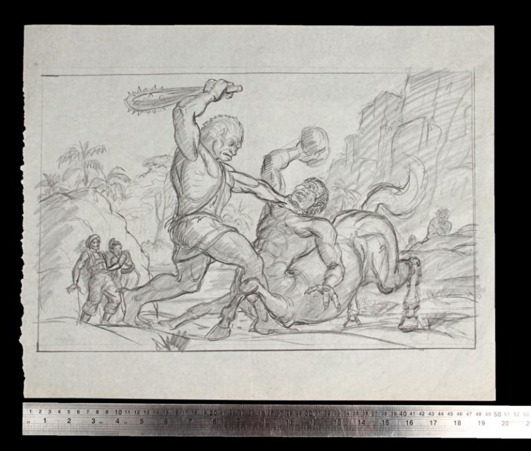 A hand-drawn concept sketch showing the Neanderthal Man fighting the Cyclopean Centaur from the Gordon Hessler fantasy film The Golden Voyage of Sinbad. This image shows the prehistoric man, club raised, with his other hand around the throat of the boulder-wielding mythical beast, with Sinbad (John Phillip Law) and Margiana (Caroline Munro) looking on. A standard Cyclops was initially envisioned for the movie, but it was decided it looked too much like "a man in a suit." The more exotic Cyclopean Centaur was then created. The artwork is rendered in pencil on white paper. One edge is irregularly cut, with the piece displaying minor wear and folds from age. Dimensions: 40 cm x 50 cm (15¾" x 19 ½")The final, key art version of this image featured on page 178 of The Art of Ray Harryhausen by Ray Harryhausen and Tony Dalton, published by Aurum. Please note this lot is sold without copyright, reproduction rights, licensing agreements or any other type of legal release. VAT Status - Margin TRIANGLE