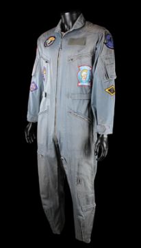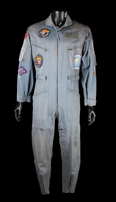 Rick 'Jester' Heatherly's (Michael Ironside) flight suit from Tony Scott’s action film Top Gun. Jester wore his flight suit during aerial operations with the US Navy’s Fighter Weapons School. This flight suit screen-matches to the scene in which Jester introduces the new Top Gun recruits to Charlie (Kelly McGillis).The flight suit is made of green material that has faded to a grayish colour, with along zip running down the front and adjustable waistbands fastened with Velcro at the hips. Zips and pockets are present along the legs, chest and arms. A Fighter Weapons School patch is stitched onto the flight suit’s right shoulder, with an array of fighter squadron patches stitched across the arms and chest. A Western Costume Co. costumiers label is present at the collar, which reads '2507-1; Top Gun; Jester'. The piece displays only minor wear from use. VAT Status - Margin