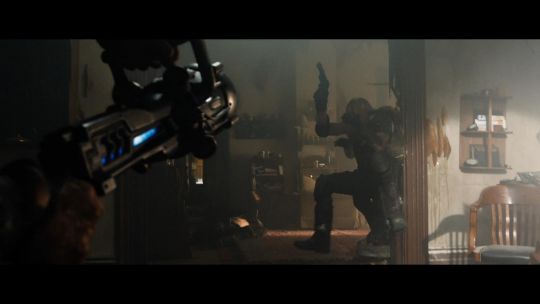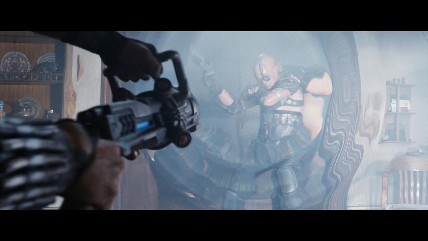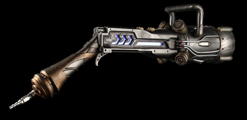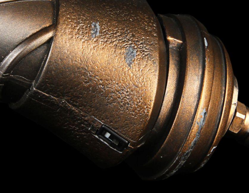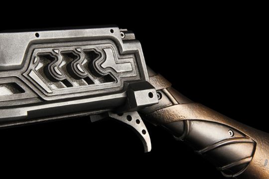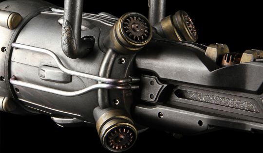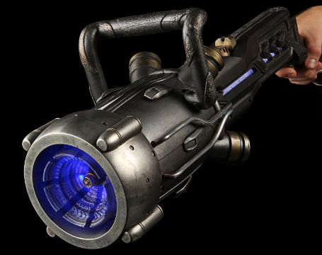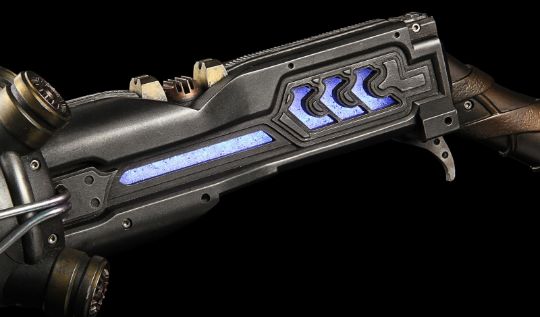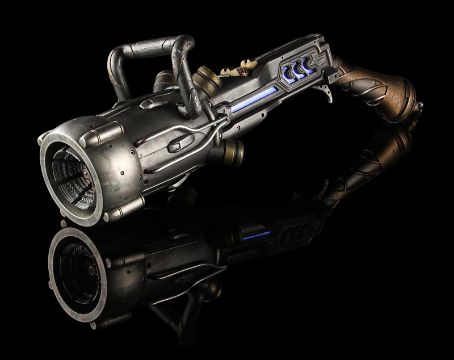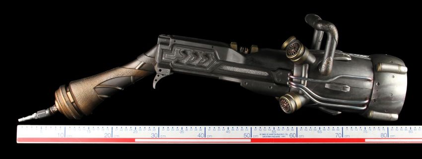 A Deci Bore gun from the sci-fi adventure film Jupiter Ascending, directed by The Wachowskis. Triggers used their weapons during the assault at Stinger Apini’s (Sean Bean) residence, where they attempted to murder Earth’s matriarch Jupiter Jones (Mila Kunis). The large weapon is constructed from cast resin, with a traditional stock and a urethane handle. It features a wide barrel with rotating centre, a small switch in the butt activates pulsing blue lights along the stock, and the trigger rotates the barrel – all powered by a 12V battery (UK 13amp charger included).Metallic grey and black paint covers the surface, with faux-bronze and copper coloured accents and metal piping. It remains in very good condition. Dimensions: 82 cm x 19 cm 31 cm (32 ¼" x 7 ½" x 12 ¼")This lot is supplied with a Warner Bros. certificate of authenticity in place of a Prop Store certificate. Payment plan on this item is restricted to a duration of one month. Please contact us for further information. As this item contains electronic components, every effort has been made to describe them accurately, however no guarantee or warranty is made as to the functionality or lifespan of those components. It is entirely incumbent on the new owner to satisfy themselves as to their use and maintenance. VAT Status - DAGGER
