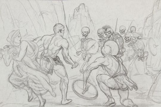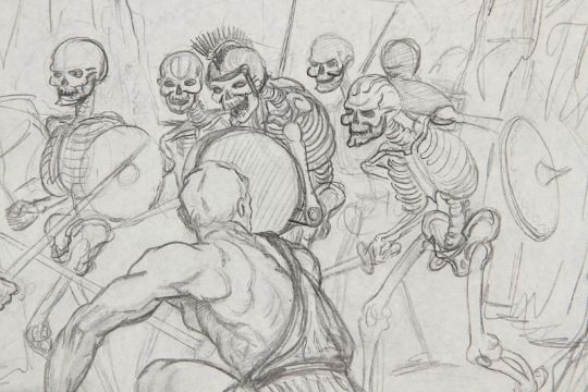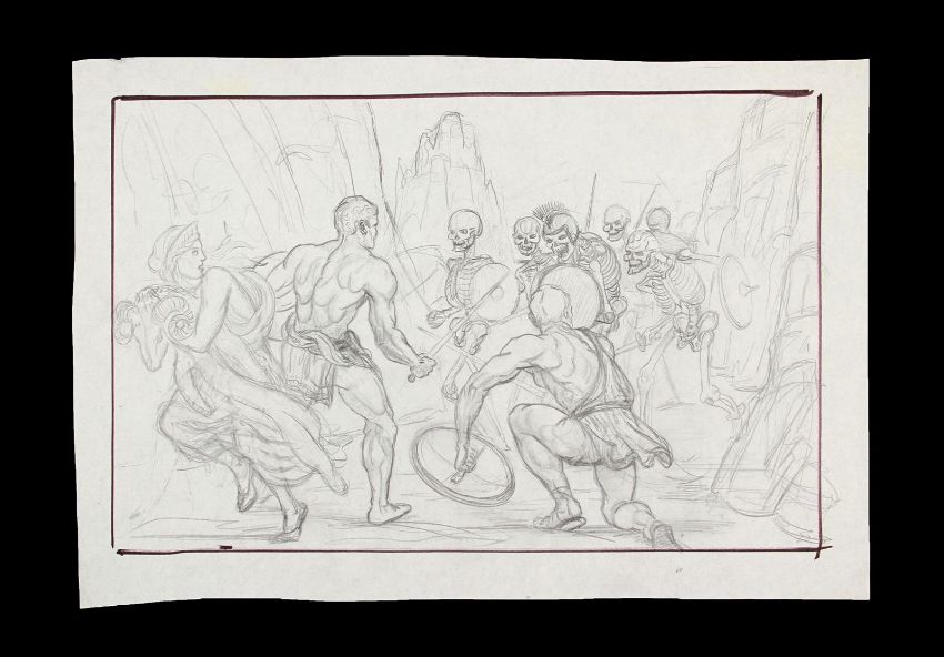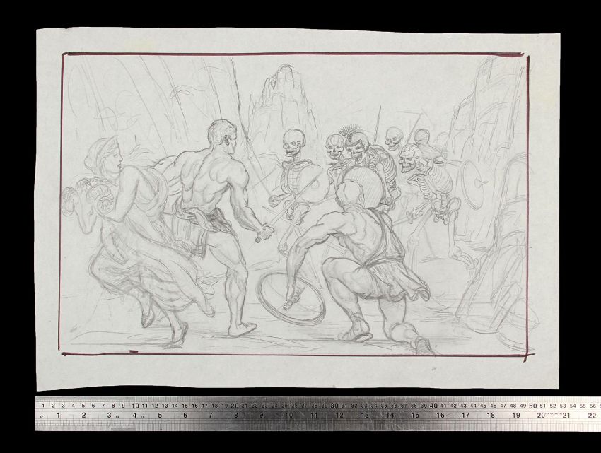 A hand-drawn concept sketch c. 1961 showing Jason (Todd Armstrong) and the skeletons from the Don Chaffey fantasy adventure Jason and the Argonauts. This image was created by legendary visual effects artist Ray Harryhausen and shows Jason and some of the Argonauts in their legendary sword fight with the Children of the Hydra, the skeleton warriors. The sketch is executed in pencil on white paper. A black ink border completes the composition. Harryhausen commented that he wanted the skeletons to bring the sense of a legion, of being a disciplined, formidable enemy. This drawing certainly conveys that feeling! The edges are irregularly cut, however the drawing exhibits minimal wear. Dimensions: 36 cm x 53 cm (14" x 21")The final key art version of this image features on page 168 of Ray Harryhausen An Animated Life by Ray Harryhausen and Tony Dalton and on page 166 of Ray Harryhausen’s Fantasy Scrapbook by Ray Harryhausen and Tony Dalton. Both published by Aurum. Please note this lot is sold without copyright, reproduction rights, licensing agreements or any other type of legal releases. VAT Status - Margin TRIANGLE
