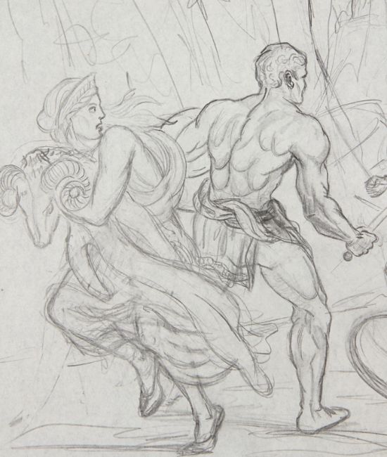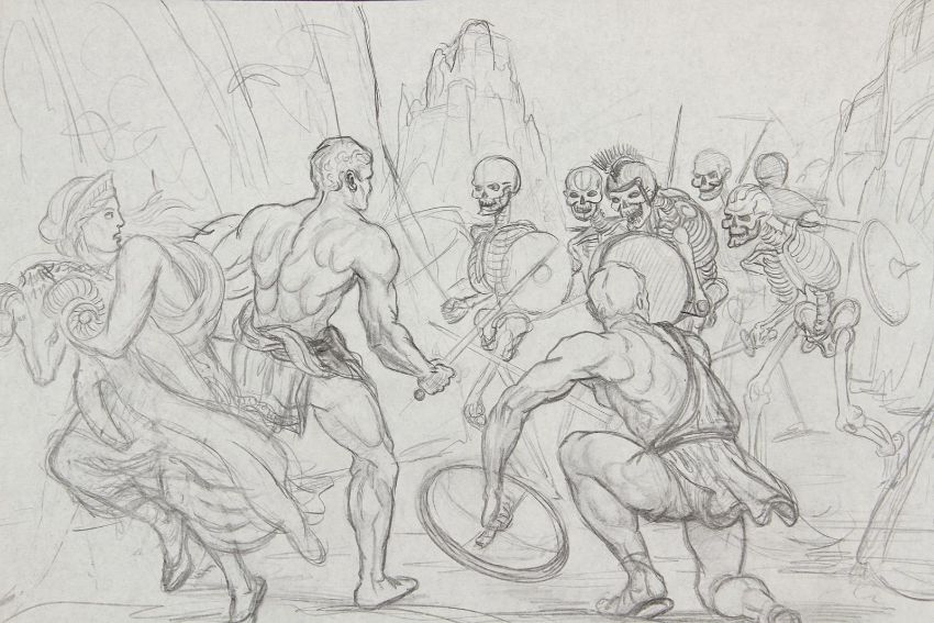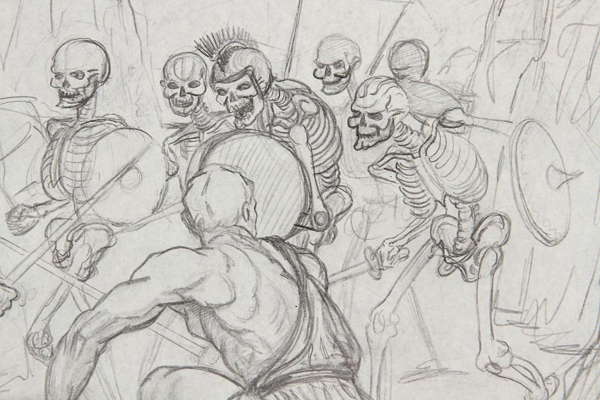 JASON & THE ARGONAUTS (1963) - Ray Harryhausen Hand-Drawn Concept of Jason (Todd Armstrong) and the Skeletons