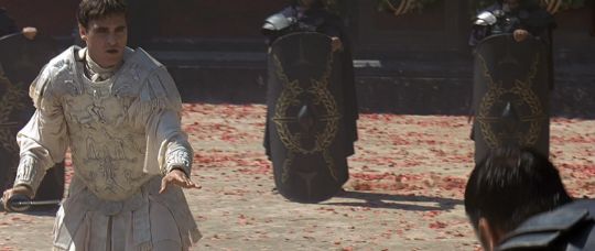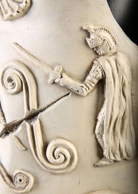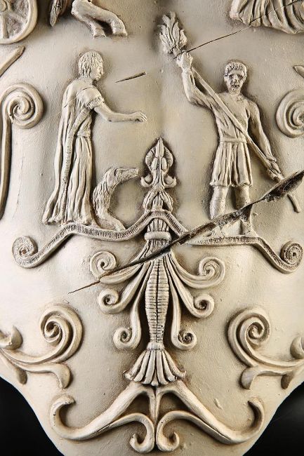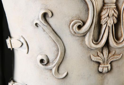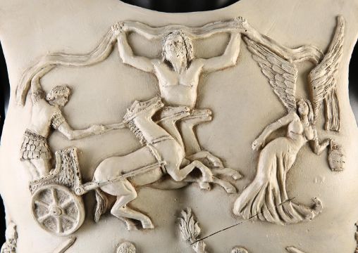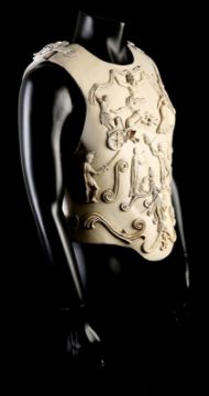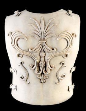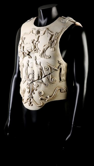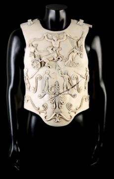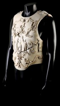 Commodus' (Joaquin Phoenix) arena armour from Ridley Scott’s Oscar-winning action epic Gladiator. This armour was made for the climactic battle in which Commodus staged a battle against an already wounded Maximus (Russell Crowe). Constructed of foam urethane, the armour is made in two parts, a front and back plate, attached at the shoulders and waist via buckled leather straps. The elegant chest plate features cast embellishments including chariot soldiers, winged angels and swirling patterns. Two diagonal gashes are inset at the chest where it would sustain battle damage during the fight. This piece was created during production, but never painted, and was painted after filming wrapped for display purposes. The armour shows minor wear, but remains in very good condition. VAT Status - OMEGA TRIANGLE