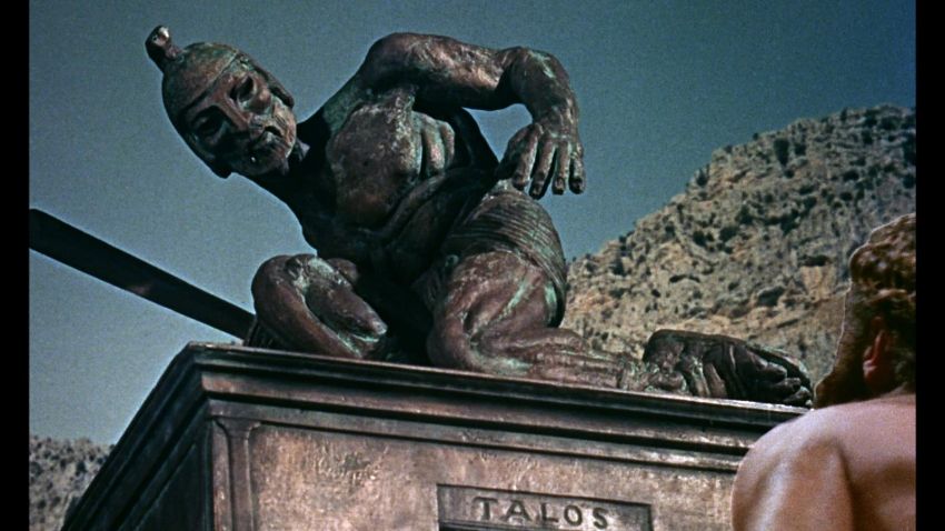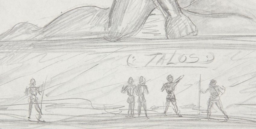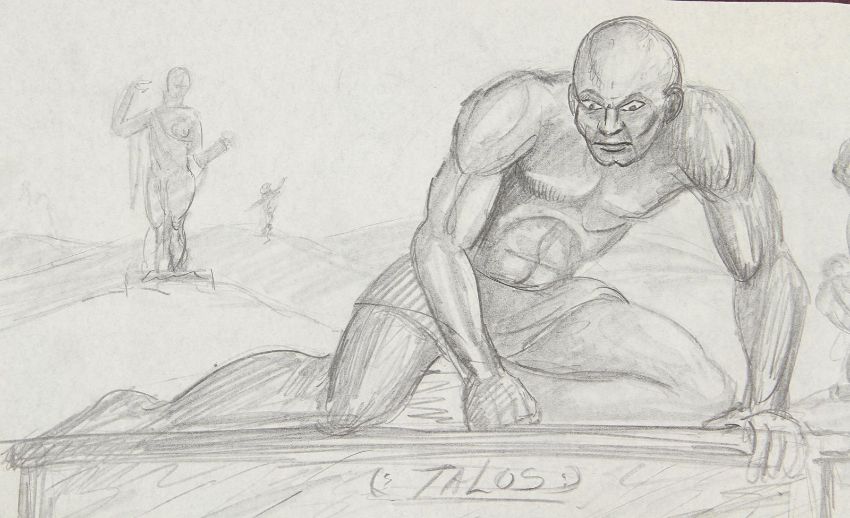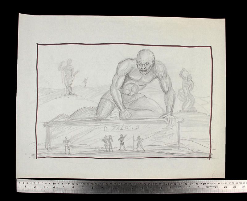 A hand-drawn concept sketch c. 1961 showing the bronze statue Talos from the Don Chaffey fantasy-adventure Jason and the Argonauts. This image was created by legendary visual effects artist Ray Harryhausen and depicts one of the most famous sequences from the film – the giant bronze statue Talos, rising up from its plinth after Hercules (Nigel Green) steals from the treasure chamber below. The sketch is executed in pencil on paper, with a black ink border. The artwork displays some minor wear, including two small tears to the edges. Dimensions: 43 cm x56 cm (17" x 22")Please note this lot is sold without copyright, reproduction rights, licensing agreements or any other type of legal releases. VAT Status - Margin TRIANGLE