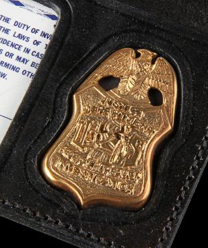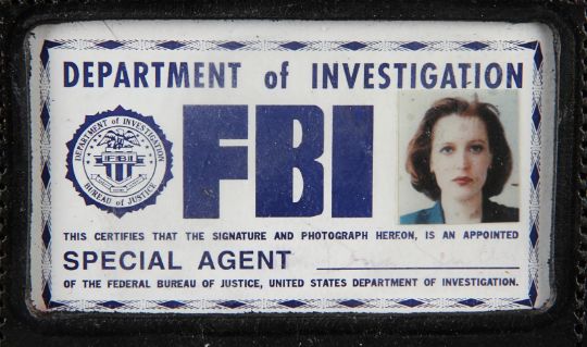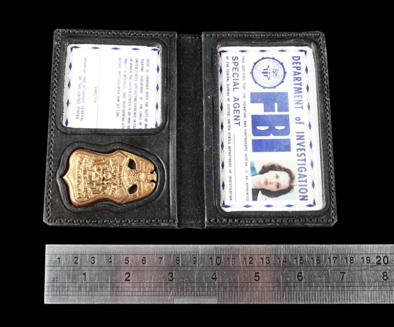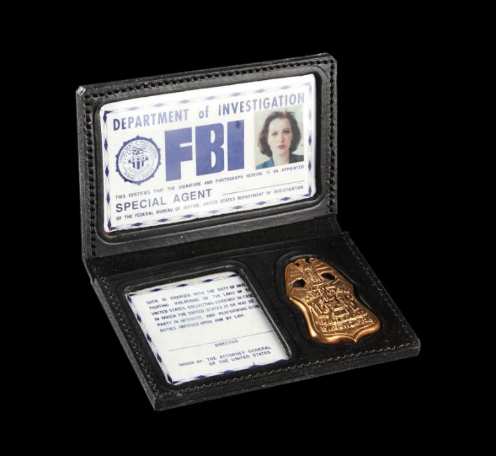 Dana Scully’s (Gillian Anderson) FBI ID badge from the award-winning sci-fi television series The X-Files. Special Agent Scully wore her ID from season two during scenes at the FBI headquarters. The ID card is printed and features a photograph of Scully along with a handwritten signature. The ID is held inside a plastic wallet with a detachable metal clip. The piece displays some minor wear, and a small amount of adhesive residue on the plastic wallet and metal clip from use on the production. Dimensions: 16.5cm x 8cm x 2cm(6 ½" x 3 ¼" x ¾") VAT Status - Margin