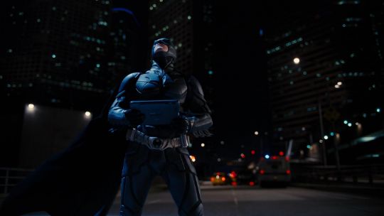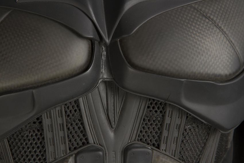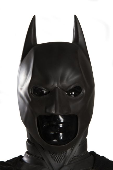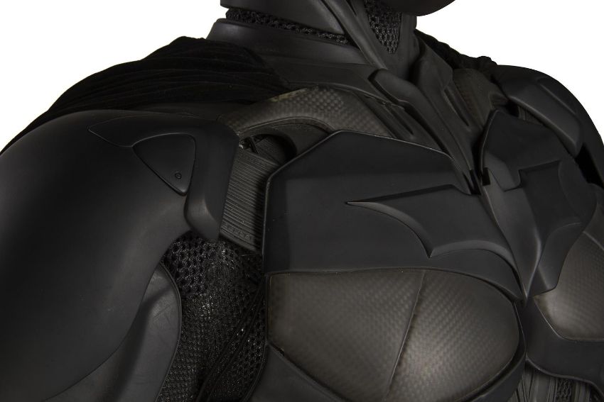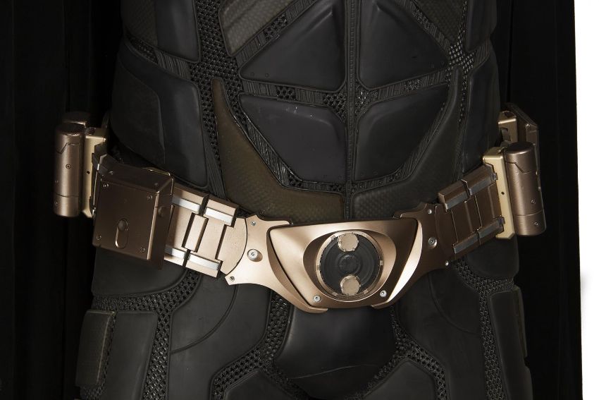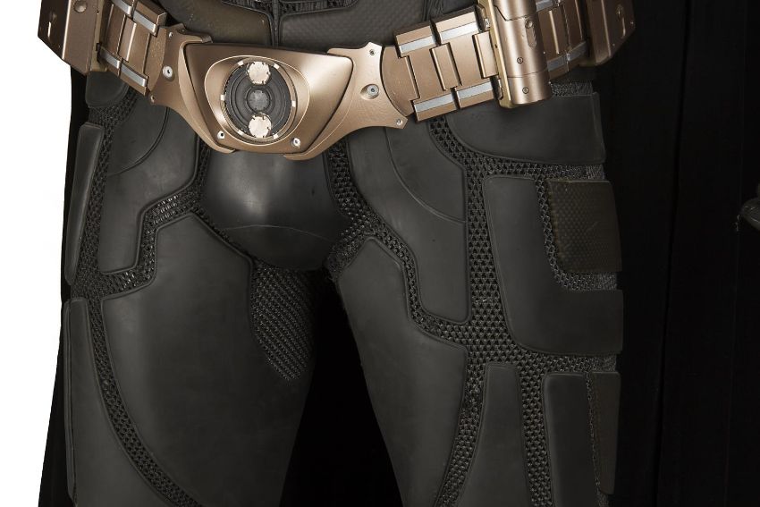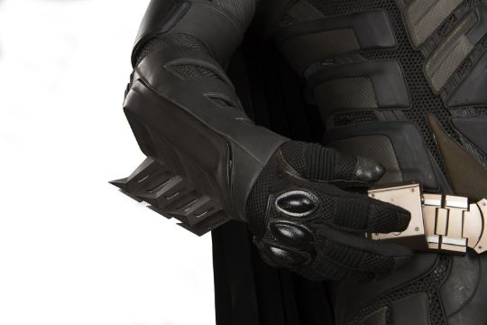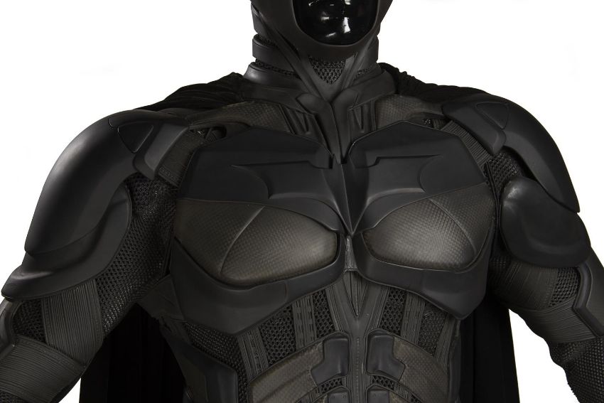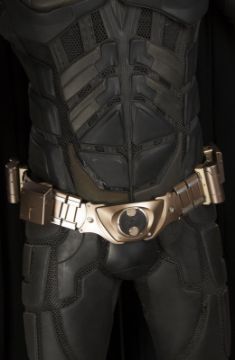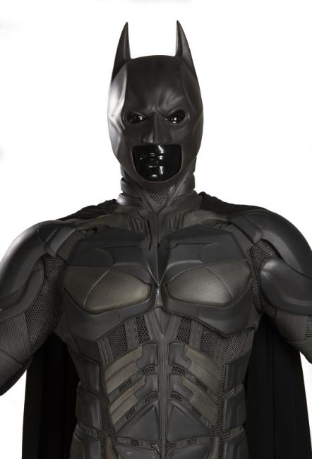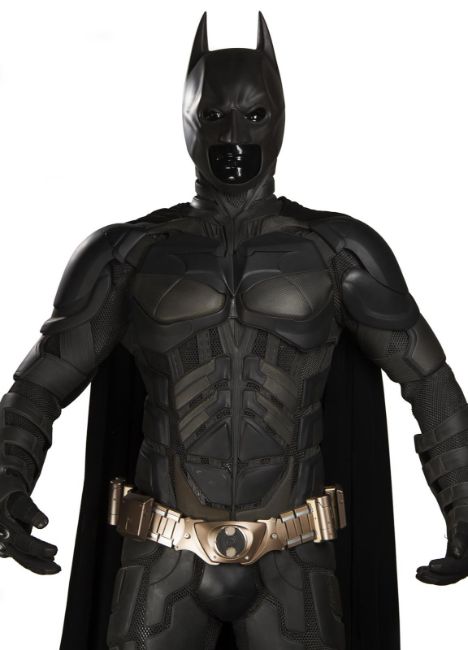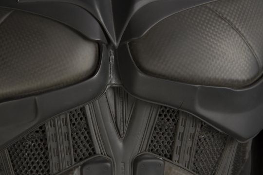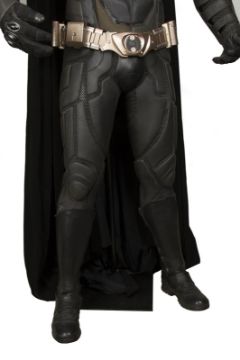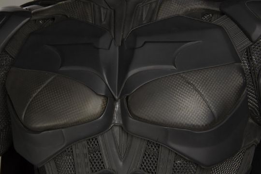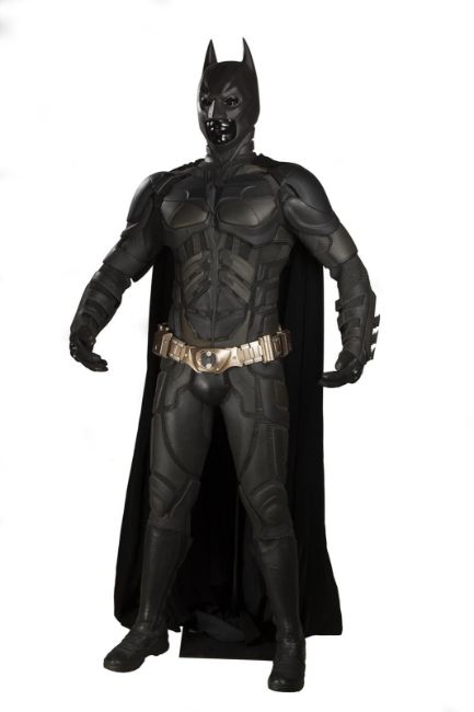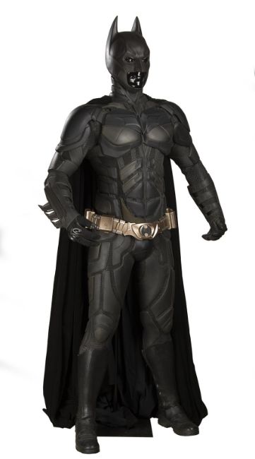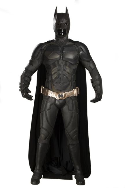 Batman's Batsuit from action films The Dark Knight and The Dark Knight Rises, directed by Christopher Nolan. Bruce Wayne (Christian Bale) wore his re-imagined Batsuit extensively in both films. The refined Batsuit, a military-inspired redesign of the Batman Begins outfit, allowed Batman to fight with increased agility at the expense of the protection afforded by its armour. The updated costume was designed by Lindy Hemming and created by costume supervisor Graham Churchyard and his team, including key sculptor Julian Murray. The most significant design change was an improved cowl, which separated the headpiece from the neck, allowing performers to turn their head in the suit for the first time. Lindy Hemming received a BAFTA Award®-nomination for her contribution to The Dark Knight.The costume’s under suit is a two-piece full-length body suit of breathable mesh fabric with integrated gloves and a hood. Plates cast in black and semi-translucent urethane are strategically fitted across the suit’s legs, torso and neck. The gloves feature leather sections with carbon fibre knuckle caps. Internal strapping provided support for the suit during the film’s frenetic action scenes. Openings are present at the waist to facilitate the use of a stunt harness. Multiple pieces of simulated armour are dressed over the under suit to complete the costume. This includes Batman’s signature cowl (marked ‘R7’), a set of upper body armour (marked ‘14’) and a pair of bracers with detachable blade panels (marked ‘L’ and ‘R’). The cowl and body armour components are made of urethane. The upper body armour is emblazoned with the Bat Emblem, as is the distinctive rubber Bat Belt, which features four static belt pouches secured with metal fittings and is finished in faux-bronze paint with the bat emblem in black. A black faux-velvet cape, a Batman Begins piece that was modified for use on the two sequels, is secured with screws at the shoulders. A pair of leather motorcycle boots (marked ‘BR7’ and ‘9’) completes the impressive costume. The costume displays some wear from use and age, with small cracks and tears present in the urethane of the upper body armour across the chest and at the right elbow. The Batsuit is presented on a custom-made mannequin display. Dimensions (displayed): 50 cm x 90 cm x 195 cm (19 ¾" x 35 ½" x 76 ¾")This lot is supplied with a Warner Bros. certificate of authenticity in place of a Prop Store certificate. Payment plan on this item is restricted to a duration of one month. Please contact us for further information. VAT Status - DAGGER