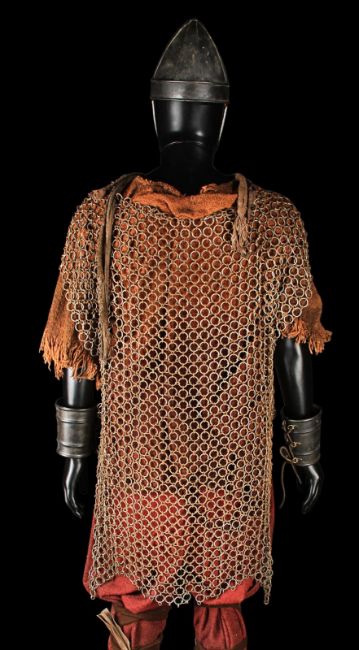A Roman archer’s costume from Ridley Scott’s Oscar®-winning action epic Gladiator. The Roman archers did battle with the barbarians of Germania during the film’s opening battle, as Maximus (Russell Crowe) led his army to victory under the watchful eye of Emperor Marcus Aurelius (Richard Harris). The costume is composed of trousers and tunic made of red-brown wool, over which is worn a pair of leather boots, a full-length suit of metal chainmail and a fibreglass helmet with a leather chin strap. The costume displays dirt and grime from use in the film’s battle sequences, and a pair of plastic bracers from a Gladiator Roman legionary have been added to complete the look of the costume. VAT Status - DAGGER