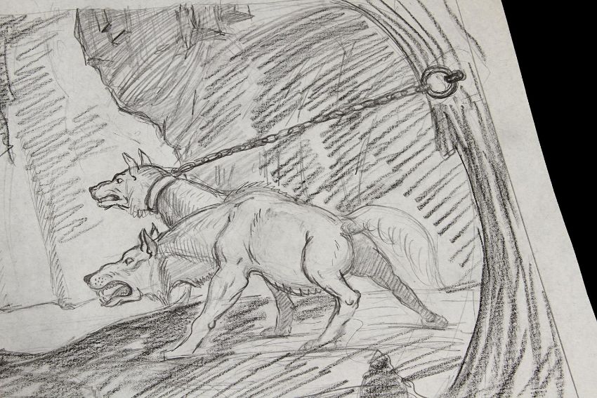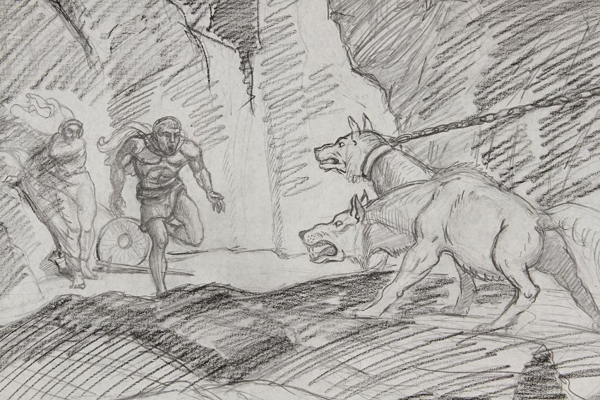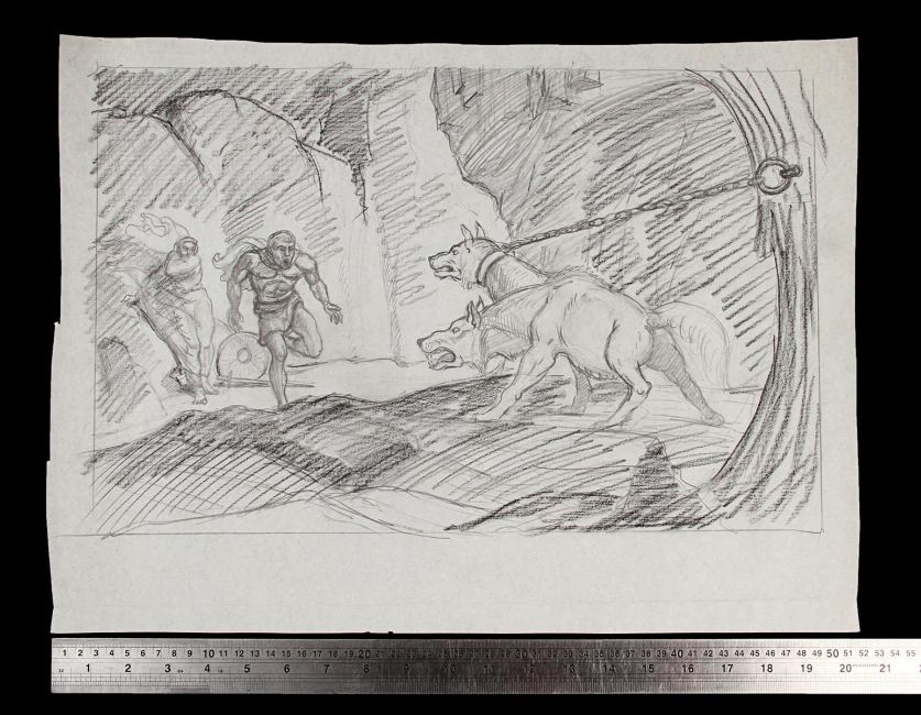 A hand-drawn concept sketch c. 1961 showing Jason (Todd Armstrong) and Cerberus, guardian of the underworld, from the Don Chaffey fantasy-adventure Jason and the Argonauts. This sequence was cut from the final film, although the creature was ultimately re-used as Dioskilos in Clash of the Titans (1981). The image was created by legendary visual effects artist Ray Harryhausen and shows Jason advancing on the fabled two-headed hound of Hades. It is executed on paper in pencil and charcoal. The edges are irregularly cut and show minor wear and folds from age. Dimensions: 38 cm x 52 cm (15" x 20 ½ ")The final, key art version of this image features on page 117 of The Art of Ray Harryhausen, page 150of Ray Harryhausen An Animated Life and on page166 of Ray Harryhausen’s Fantasy Scrapbook. All three books by Ray Harryhausen and Tony Dalton are published by Aurum. Please note this lot is sold without copyright, reproduction rights, licensing agreements or any other type of legal release. VAT Status - Margin TRIANGLE