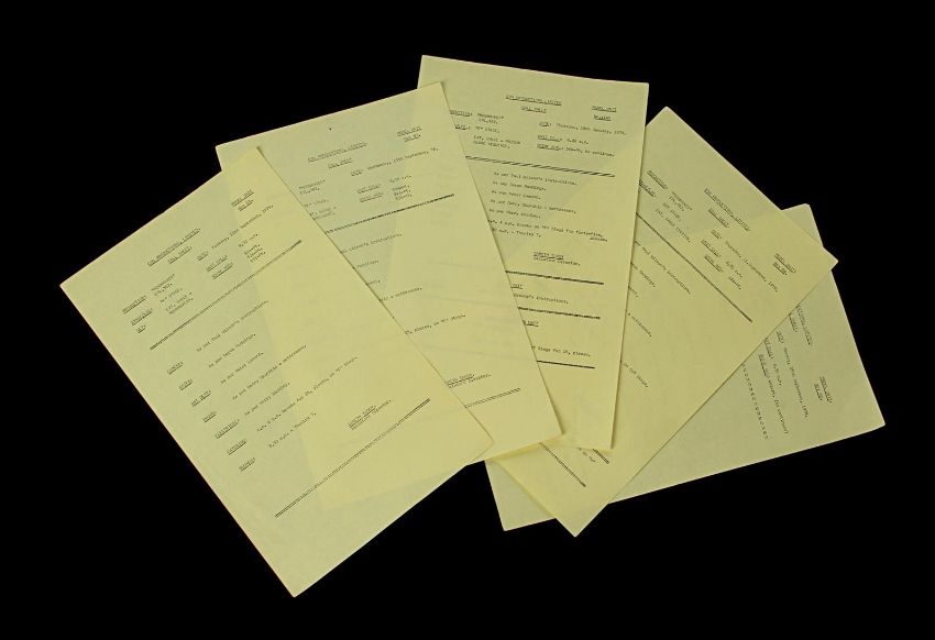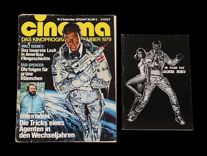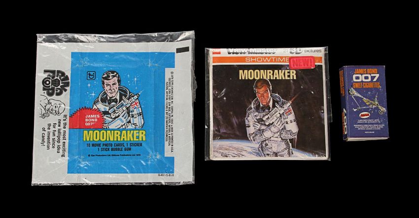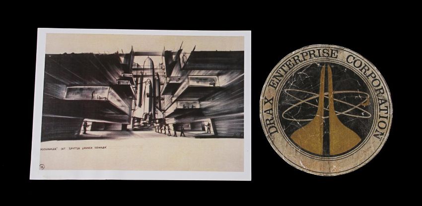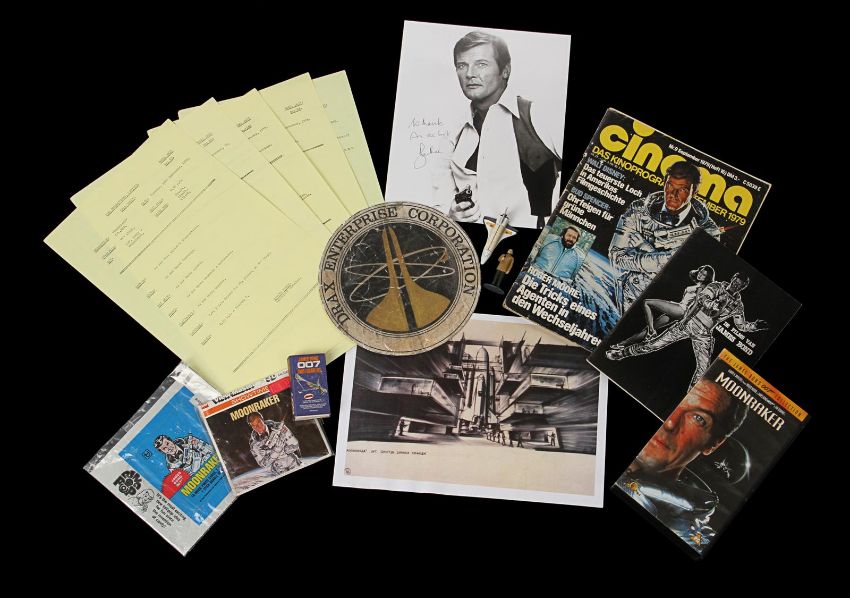 A set of production call sheets and ephemera from Lewis Gilbert’s James Bond film Moonraker. The five call sheets are printed on yellow folio paper, dated from 12 September to 25 September1978. They feature information for the film’s model unit, listing persons involved in the shoot on that day. Accompanying the sheets is an array of material, including a printed paper Drax Enterprise Corporation logo, an autographed black-and-white photograph of Roger Moore, a printed drawing of the shuttle launch complex, a VHS copy of the film, merchandise wrappers, toys and promotional material. Showing signs of age, the pieces display minor creases and wear. Dimensions (call sheets): 33 cm x 21 cm (13" x 8") VAT Status - Margin
