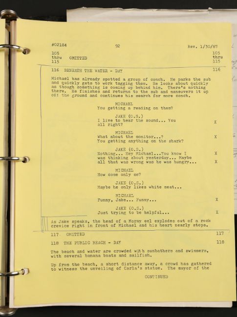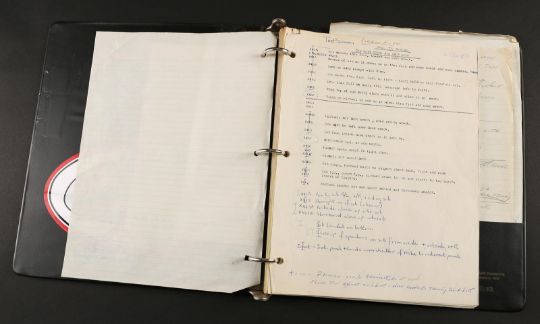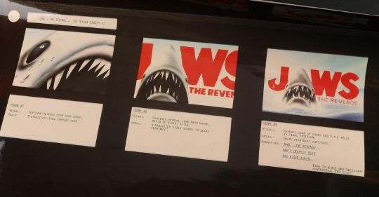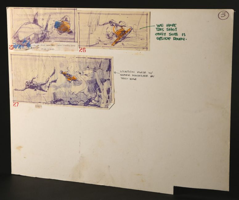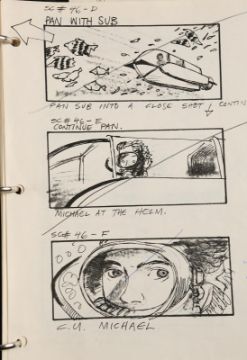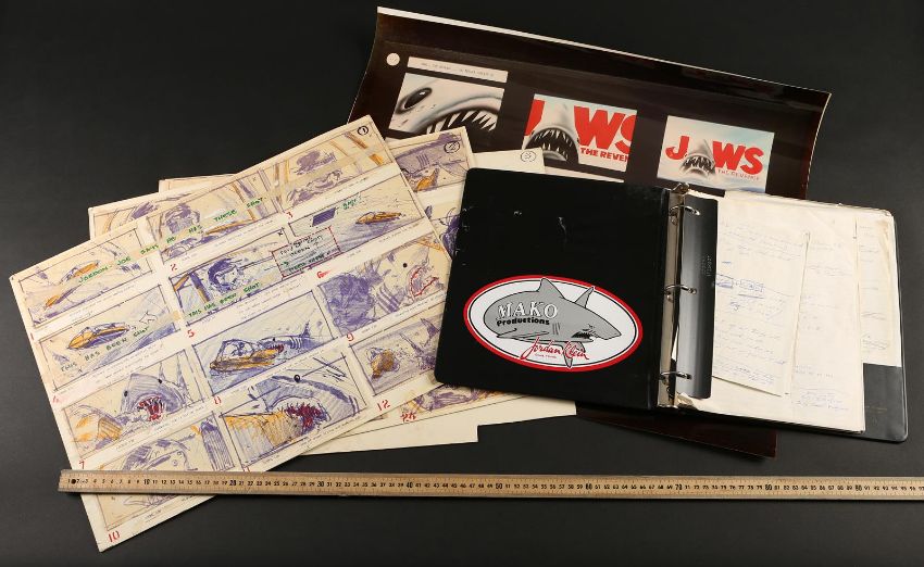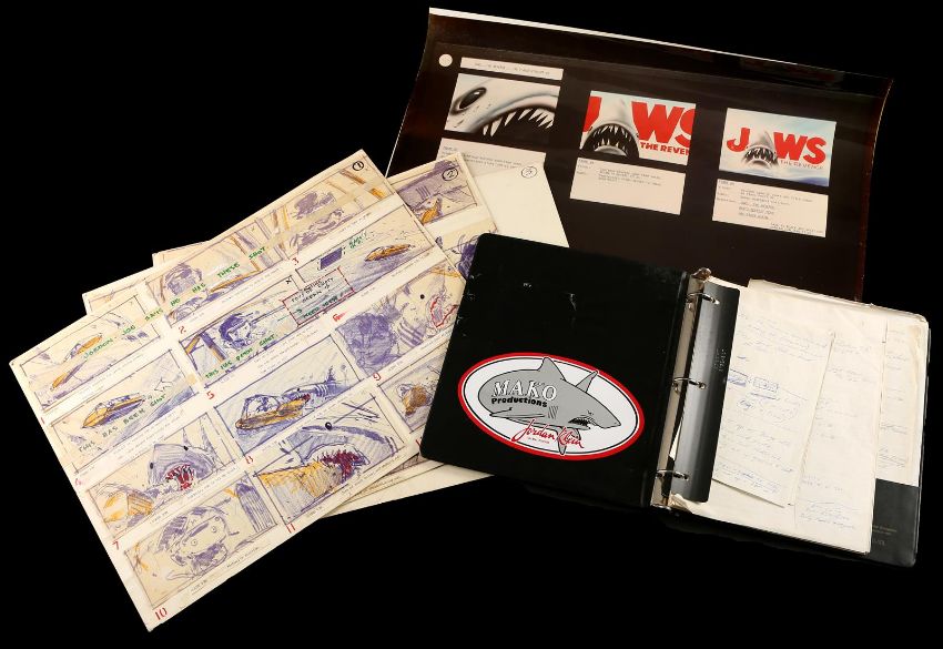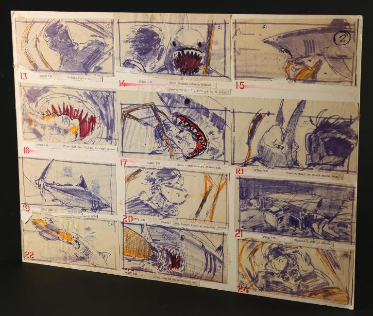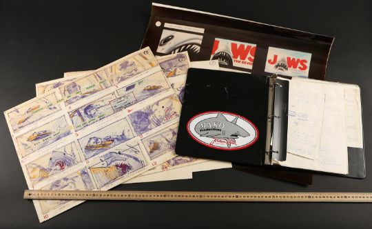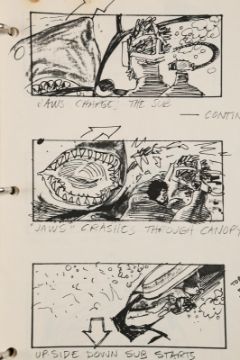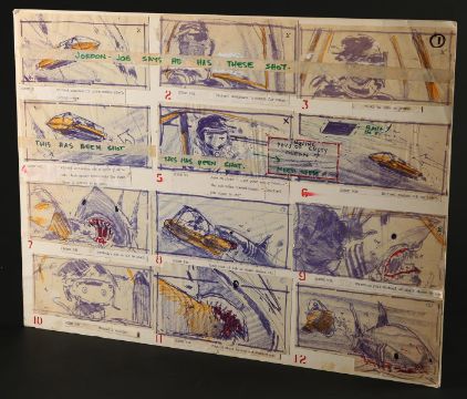 A collection of storyboards and an FX sequence production binder from Joseph Sargent’s thriller Jaws: The Revenge. The lot includes three illustration boards containing hand-coloured storyboards, a print of three storyboards for the film's teaser trailer, and a binder containing printed storyboards, handwritten notes, and script pages from various FX sequences. The illustration boards include printed storyboards pasted to the surface, with most showing hand-colouring with marker. Below each image is a typed description of the action. The poster depicting the teaser trailer concept shows three storyboards, each one progressively zooming out from the shark's head to reveal the film title. The production binder was used by the underwater director of photography, Jordan Klein, and includes handwritten notes, a shot list, revised script pages and storyboards. The set shows some wear due to production use and age, but remains in fine condition. FX binder dimensions: 26 cm x 30 cm x 4 cm (10 ¼" x 11 ¾" x 1 ½"); storyboard dimensions: 37.5 cm x 50 cm x 0.5 cm (15" x 20" x ¼"); teaser poster dimensions (rolled): 60 cm x 5 cm x 5 cm (24" x 2" x 2") Please note this lot is sold without copyright, reproduction rights, licensing agreements or any other type of legal releases. VAT Status - OMEGA
