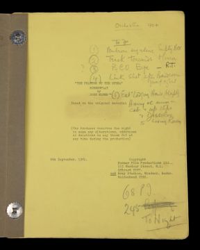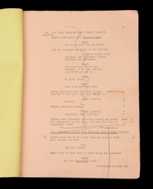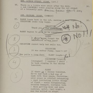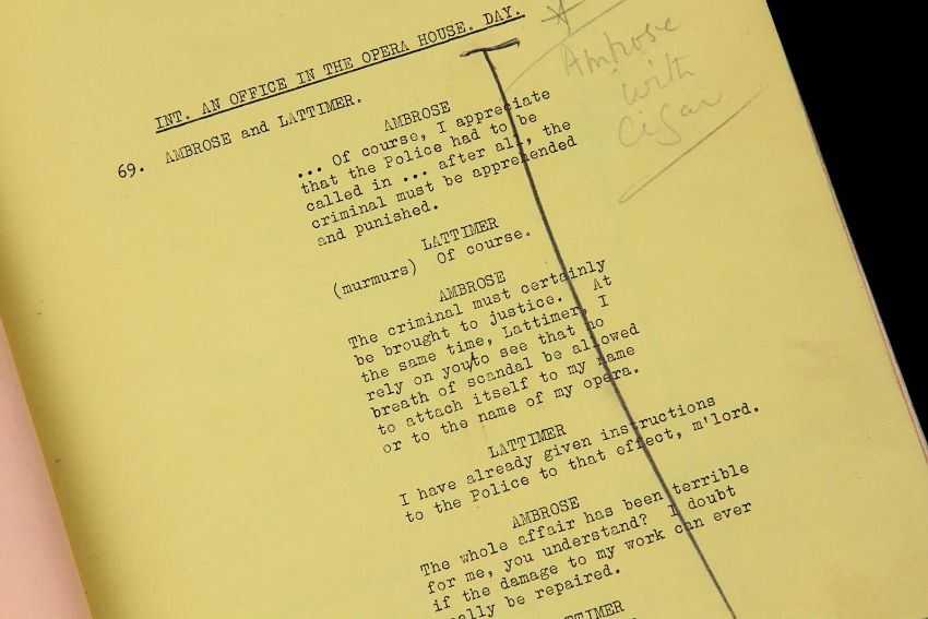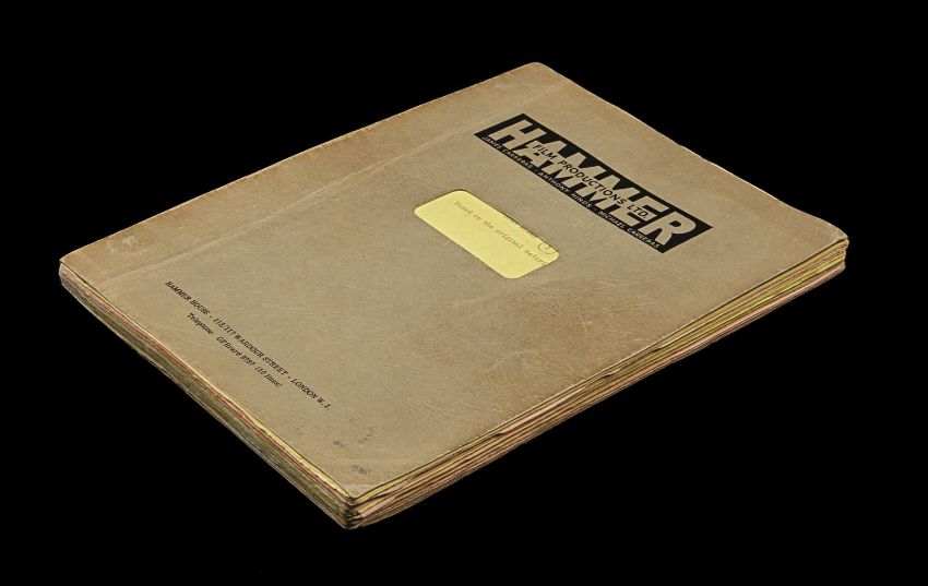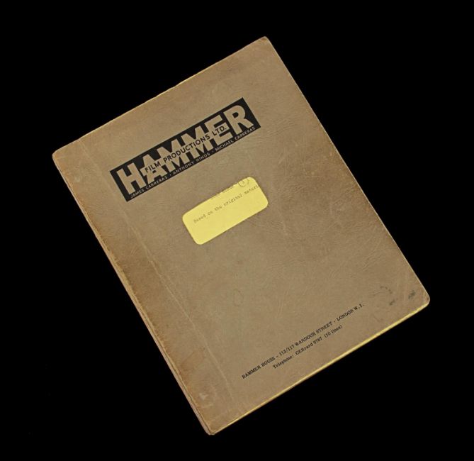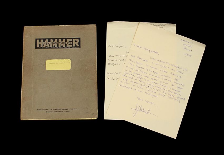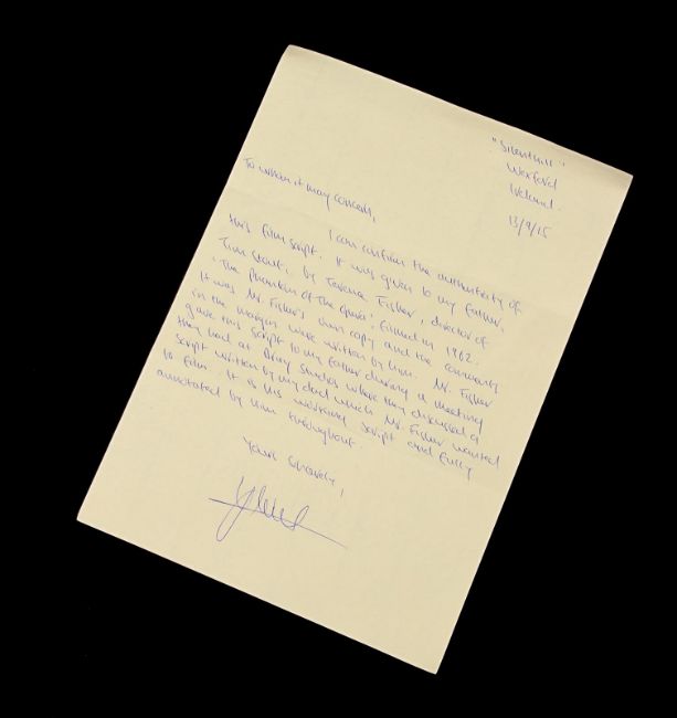 A script belonging to director Terence Fisher from the classic Hammer horror film The Phantom of the Opera. The script contains personal annotations and amendments to almost every page, handwritten in pencil and red ink. These provide a unique insight into the creative process of Hammer’s most renowned director. The script is covered in olive green card, with 'Hammer Film Productions Ltd' and the Hammer House address printed on the cover, and a small cut out window. It contains 106 printed US Legal pages in yellow and pink-coloured revisions, bound with two metal split pins. It displays signs of production use, including creasing and small stains on the cover, and it is accompanied by a letter of provenance. Dimensions: 28 cm x 22 cm x 2 cm (11" x 8 ½" x ¾") VAT Status - Margin TRIANGLE
