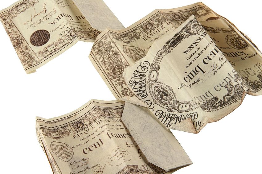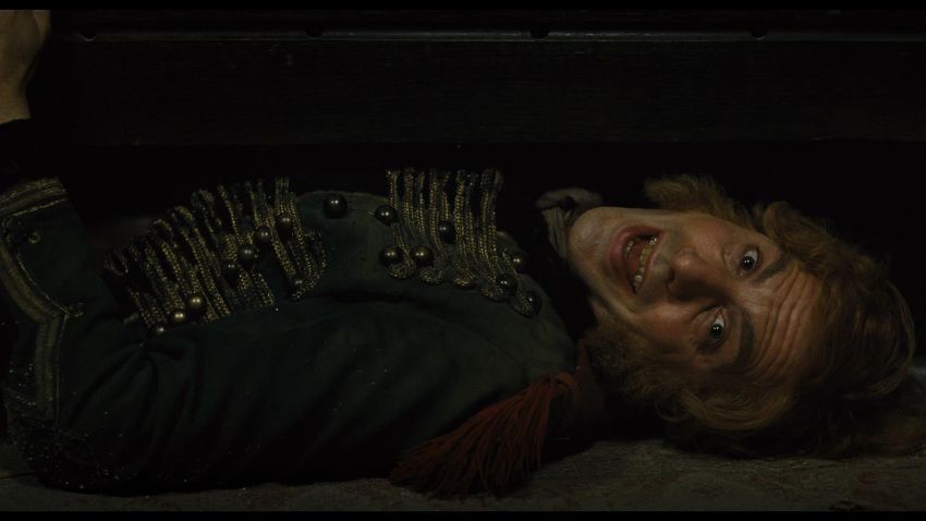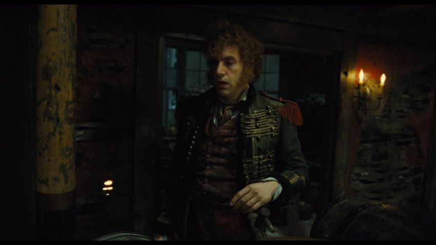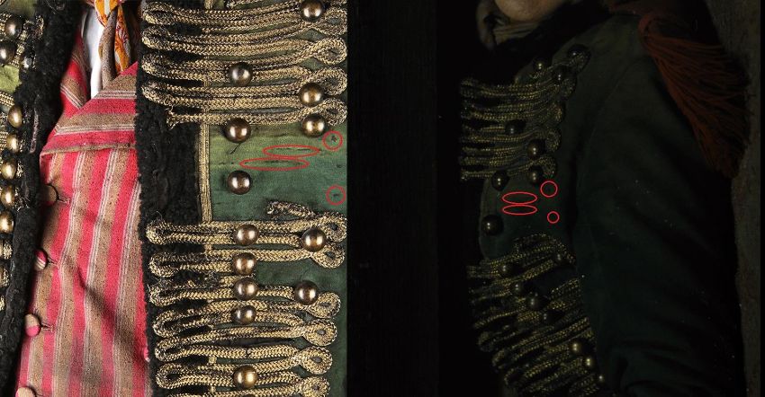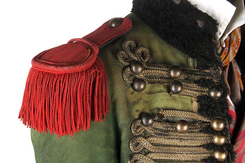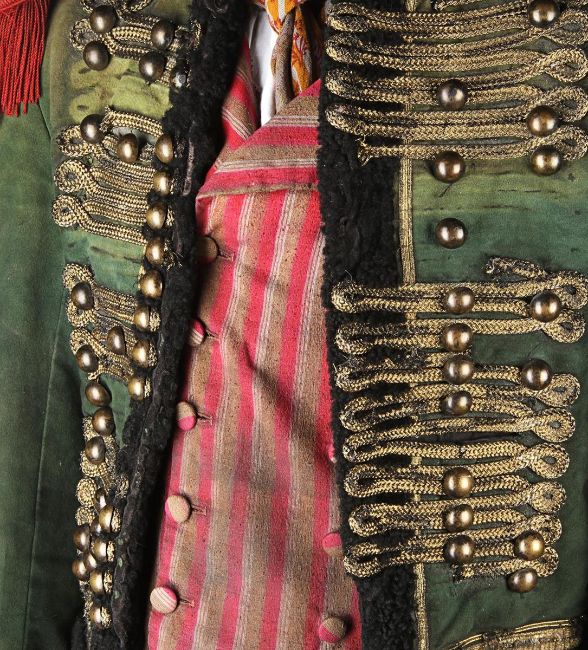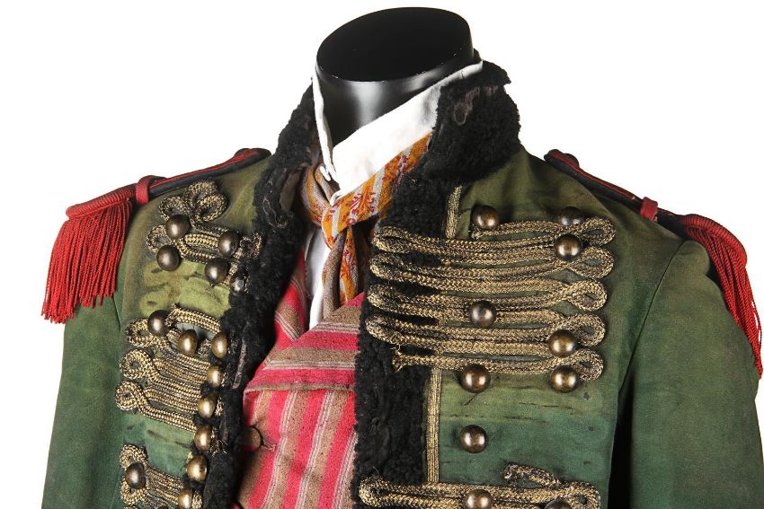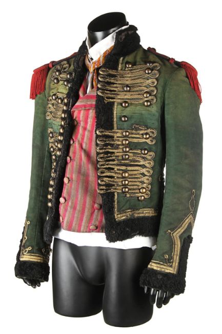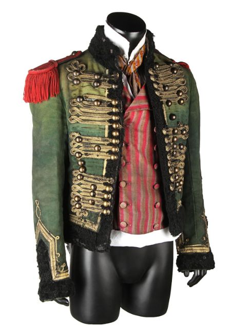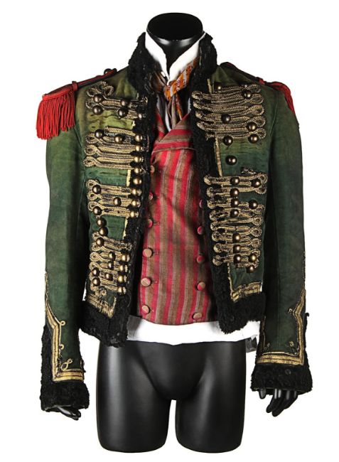A costume worn by Thénardier (Sacha Baron Cohen) in Tom Hooper’s Academy Award®-winning musical drama Les Misérables. The costume screen matches to the scene in Thénardier and Madame Thénardier’s (Helena Bonham Carter) inn. It consists of a green Napoleonic Hussar jacket, a white shirt, a red and brown striped double-breasted waistcoat, and a yellow and blue striped necktie. The jacket is made from green felt material featuring rows of faux-gold braids with round metal buttons along the front. Red fringed epaulettes sit atop the shoulders and the collar and cuffs are edged with black faux-fur. The costume has been intentionally distressed by production, with a number of buttons and braids missing from the jacket. A brown leather wallet containing six French banknotes accompanies the costume, and the jacket, shirt and waistcoat each display an Academy Costumes label. VAT Status - Margin
