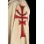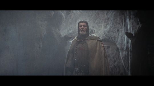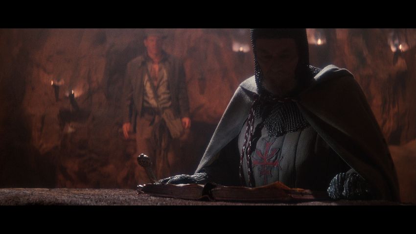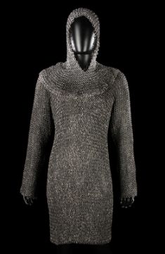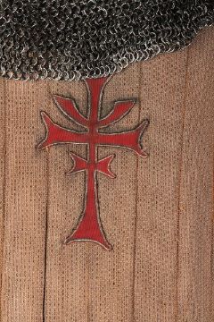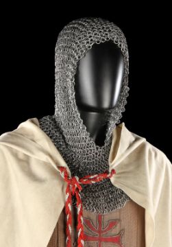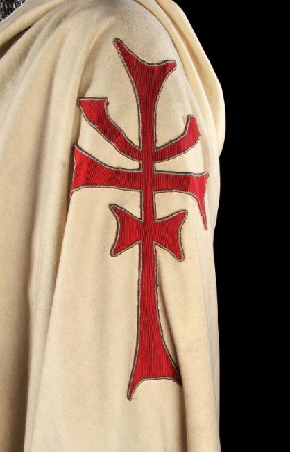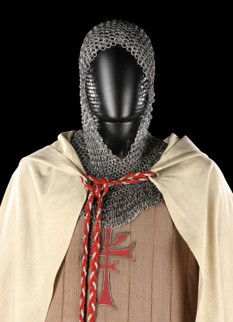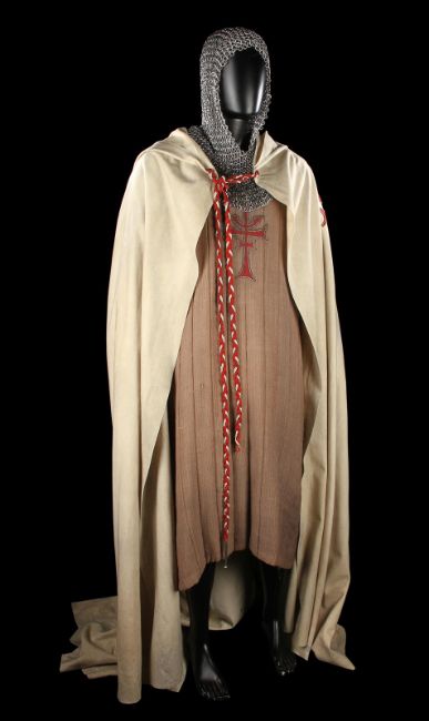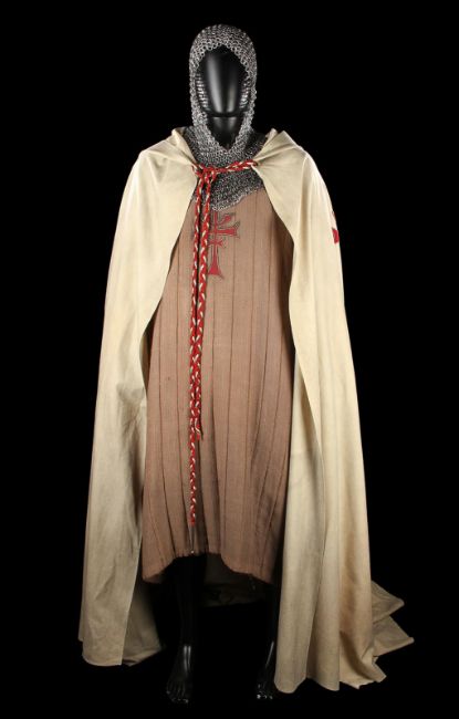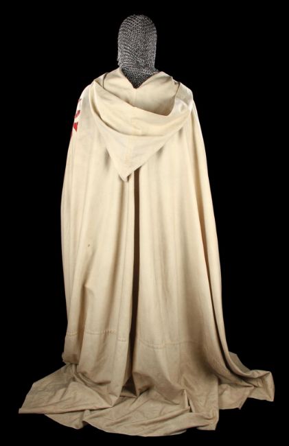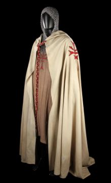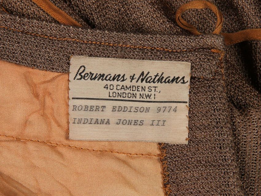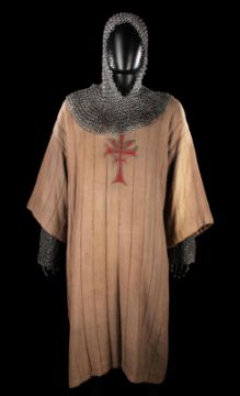 The Grail Knight’s (Robert Edison) costume from Steven Spielberg's adventure film Indiana Jones and the Last Crusade. The knight wore his costume at the end of the film when the final test for the Holy Grail is undertaken by Indiana Jones (Harrison Ford). The costume consists of a cream hooded cape, brown tunic, chainmail hood and matching hauberk. The cape is made from felt that has been distressed, with a large red and silver embroidered patch on the back. It secures at the chin with a plaited red and silver rope with a metal end. Made from a woven padded fabric, the tunic features a cross patch on the front matching the one on the cape and ties together at the back. It displays a Bermans and Nathans costumier label on the interior that reads 'Robert Edison 9774 Indiana Jones III'. Signs of ageare evident, including sun damage and minor plucks on the tunic, and the rope fastening is missing a metal end. VAT Status - DAGGER