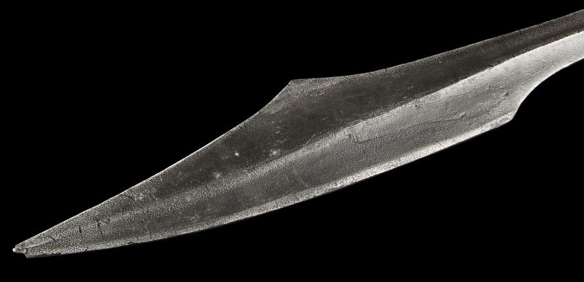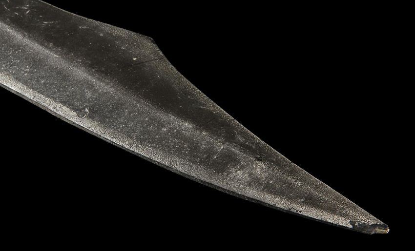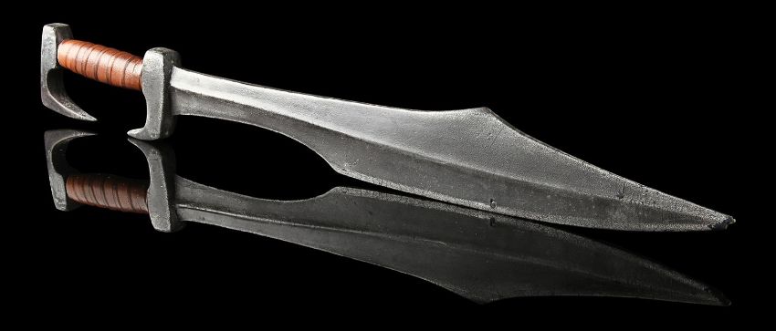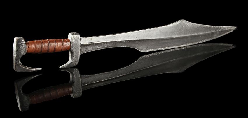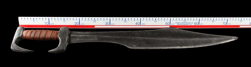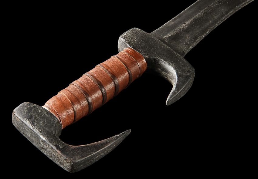 Queen Gorgo's (Lena Headey) sword used in the sword-and-sandals prequel 300: Rise of an Empire, directed by Noam Murro. The Queen consort of the Greek city Sparta was given her late husband Leonidas’ (Gerard Butler) sword after the Spartan defeat, and later wielded it during the climactic battle with the Persian army. Crafted from urethane with an internal metal armature for support, the weapon is painted shades of metallic grey to resemble aged metal, with a curved blade edge and hooked handle and pommel. The grip is wrapped with brown leather and the entire piece is well-used. There is a small chip on the tip of the blade and some paint has rubbed away, but otherwise it remains in good condition. Dimensions: 73 cmx 9 cm x 2.5 cm (28 ¼" x 3 ½" x 1")This lot is supplied with a Warner Bros. certificate of authenticity in place of a Prop Store certificate. Payment plan on this item is restricted to a duration of one month. Please contact us for further information. VAT Status - DAGGER