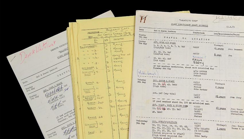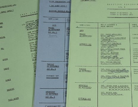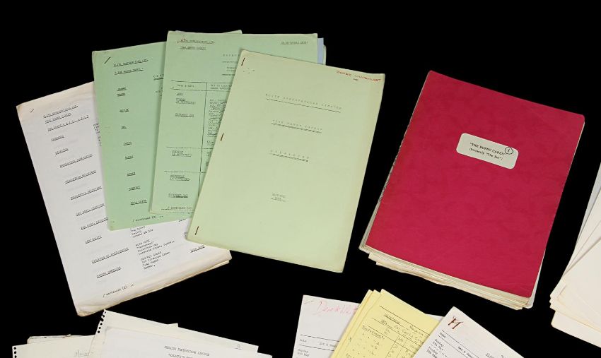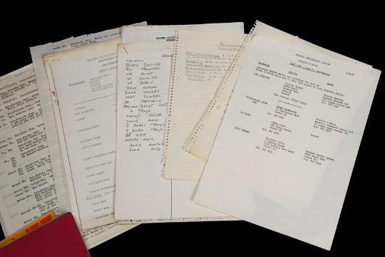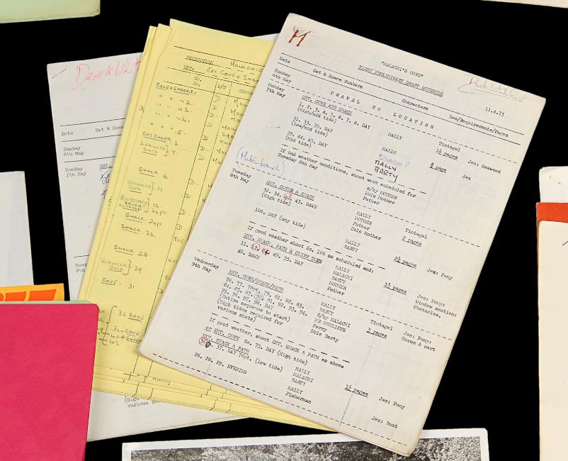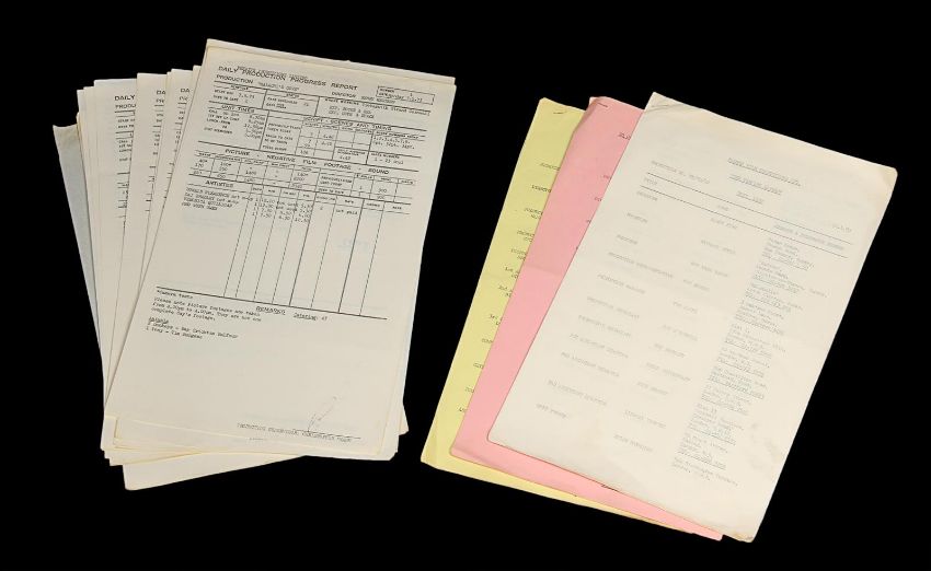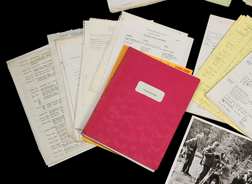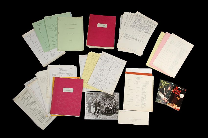 A set of production materials used at Bray Studios during the 1960sand 1970s. Many Hammer film productions were created at Bray Studios, a film and television facility in Berkshire, England. This set is comprised of two scripts and an array of production paperwork and printed materials, including a Bray Studios brochure, four Hammer Production unit lists, shooting schedules, memos, progress reports, breakdowns, cast lists and a Scars of Dracula photograph. The scripts are from the Bray Studios productions Malachi’s Cove and The Bunny Caper, and were used by first assistant director Derek Whitehurst, featuring handwritten annotations throughout. The pieces display some wear from production use, including edge creases and tears, with some paper yellowing from age. Dimensions(per script): 28 cm x 22 cm x 2 cm (11" x 8 ¾" x ¾") VAT Status - Margin