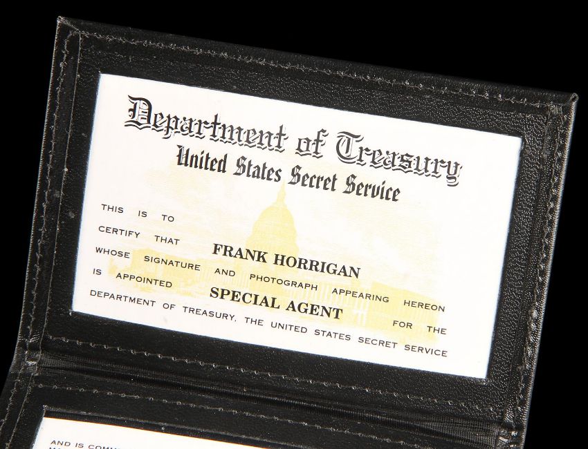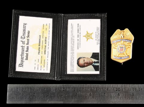 Frank Horrigan’s (Clint Eastwood) Secret Service photo ID from Wolfgang Petersen’s thriller In the Line of Fire. Horrigan used his ID throughout the film, however the identification cards are ultimately not seen on screen. The two Department of Treasury cards are made of thin white card. The first displays Horrigan’s name and rank, while the second bears an original production photo of Eastwood in character. The ID cards are accompanied by a replica black faux-leather wallet and replica metal Secret Service shield with all components remaining in very good condition. Dimensions: (each card) 11.5 cm x 6.5 cm (4 ½" x 2 ½") VAT Status - Margin