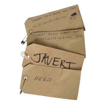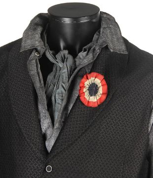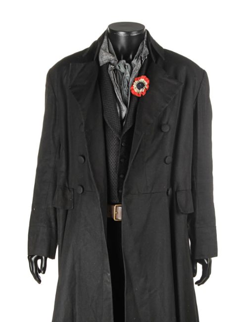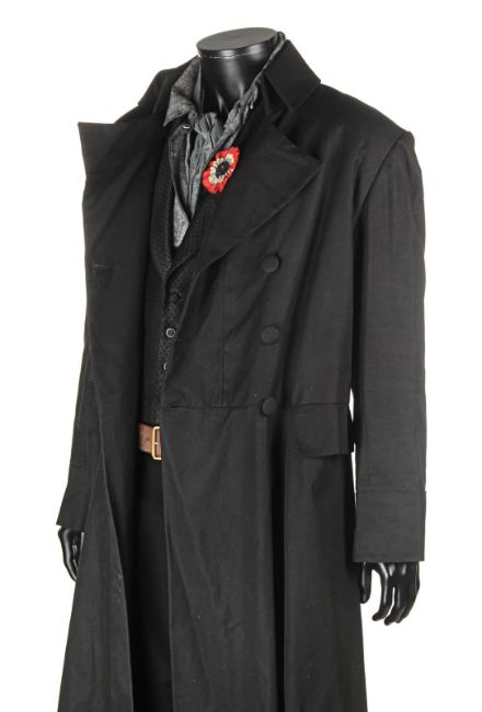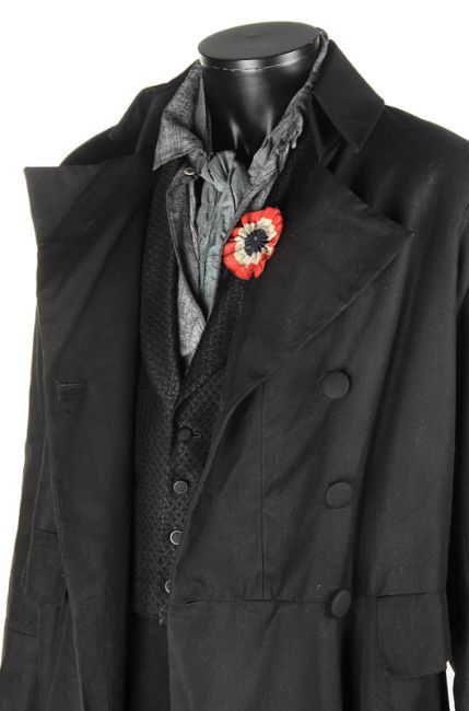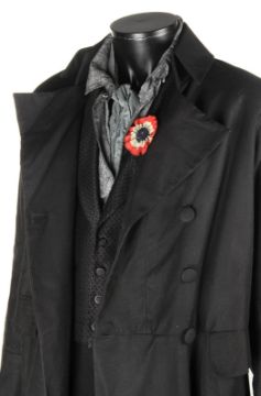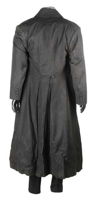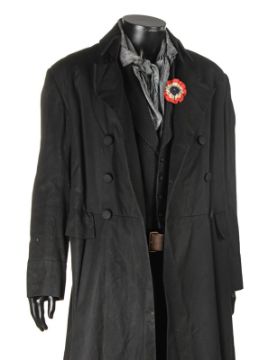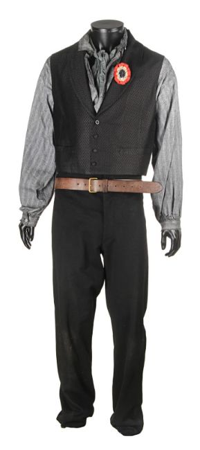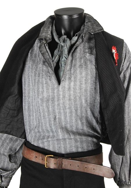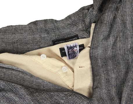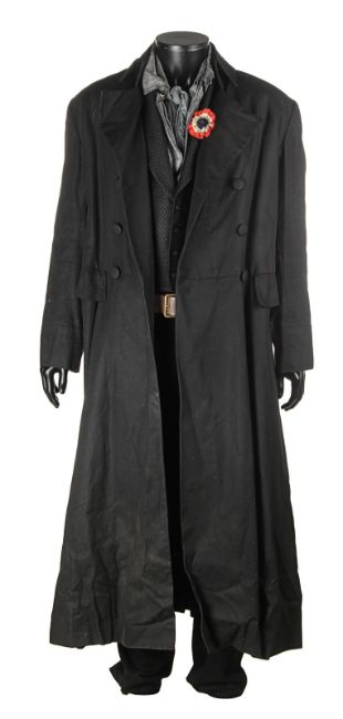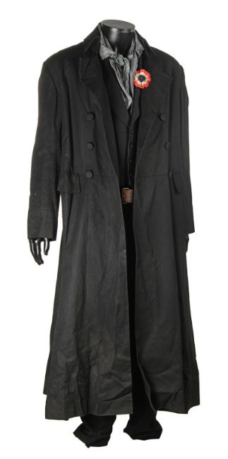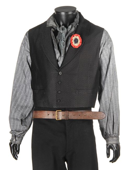 Javert's (Russell Crowe) hero revolutionary costume from Tom Hooper’s Academy Award®-winning musical drama Les Misérables. Javert wore his black costume when going undercover as a rebel to spy on the revolutionaries. The costume consists of a black coat, black trousers, black waistcoat, grey striped linen shirt, cream short-sleeved vest, brown leather belt and a light blue ragged neck tie. The double-breasted coat features black buttons across the front and a long vent in the back. The trousers are made of wool, with black buckled stirrups at the ankles. The waistcoat displays a criss-cross design throughout with a revolutionary rosette on the lapel and a laced back. With the exception of the belt and necktie, each component features an Academy Costumes label. There is a small hole under the collar of the grey shirt, however overall the costume remains in very good condition. VAT Status - Margin