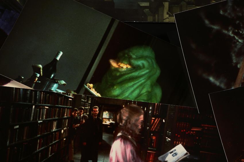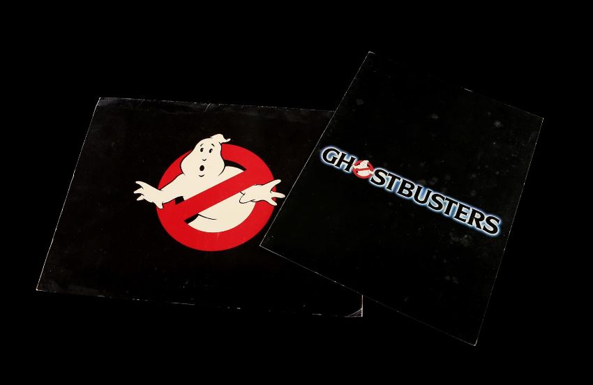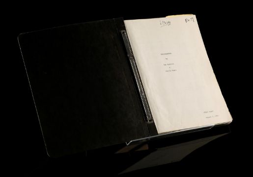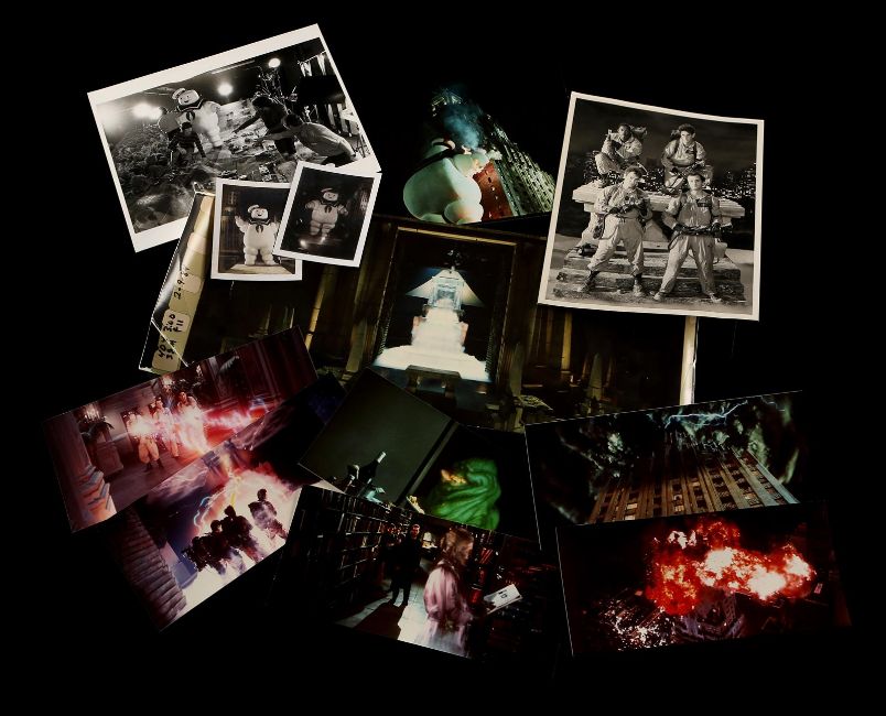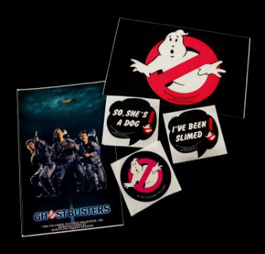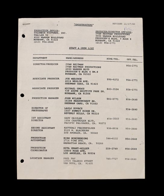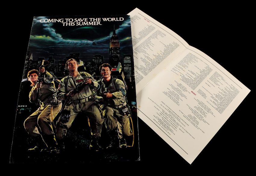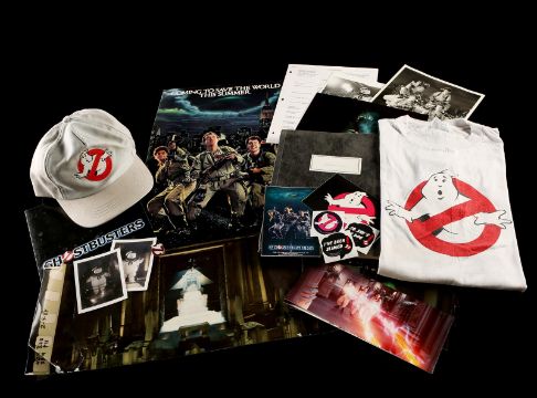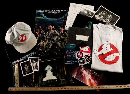 A first draft script, production materials and crew apparel from Ivan Reitman's supernatural comedy Ghostbusters. Written by Dan Aykroyd and Harold Ramis, the 135-page script is dated 5 August 1983 and was issued to Richard Edlund in the visual effects department. A number of sequences involving special effects are highlighted in blue marker. Paired with the script is a collection of Kodak Cibachrome prints, miniature set photographs, a staff and crew contact list, screening programs and crew apparel. The apparel includes a large cotton T-shirt, adjustable cap, a pin, and stickers. The lot shows minor wear, but remains in very good condition. Script dimensions: 21.25 cm x 25 cm x 2.5 cm (8 ½" x 11" x 1") VAT Status - OMEGA