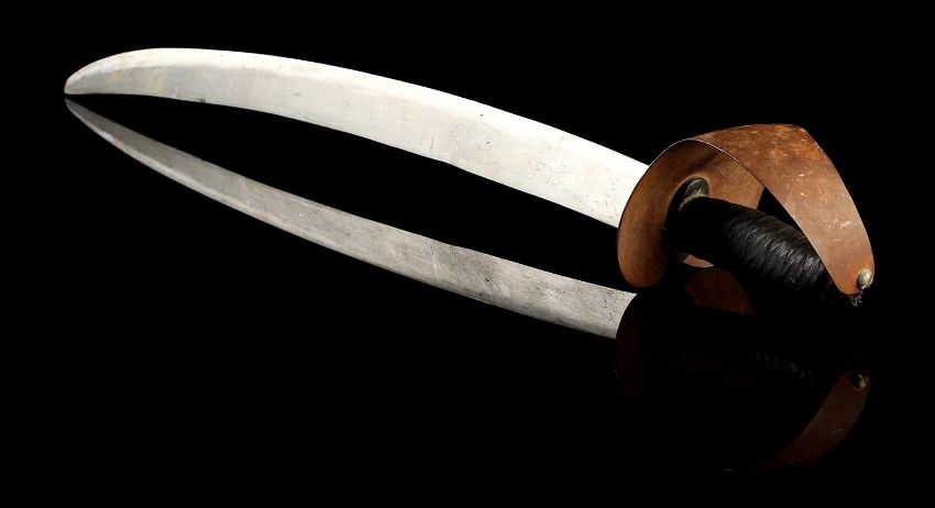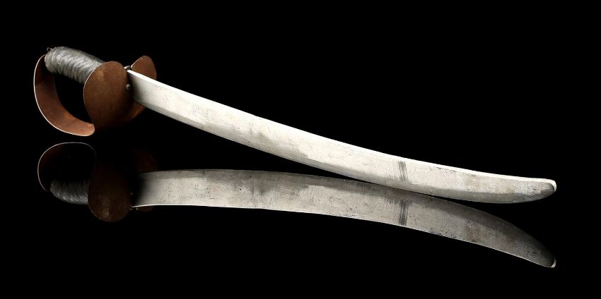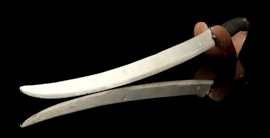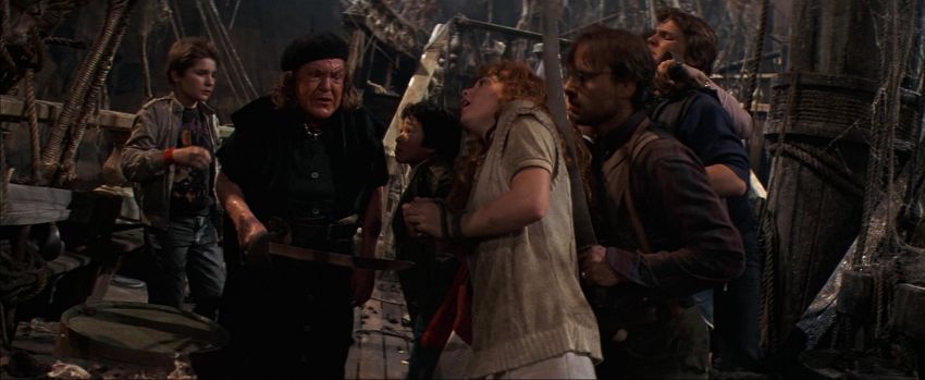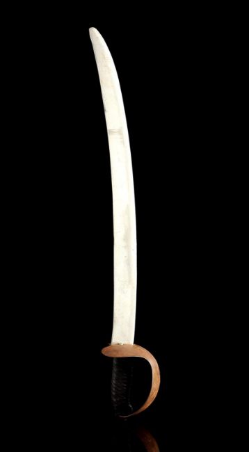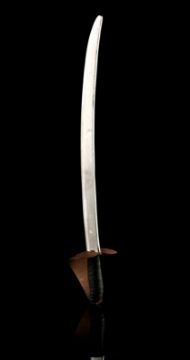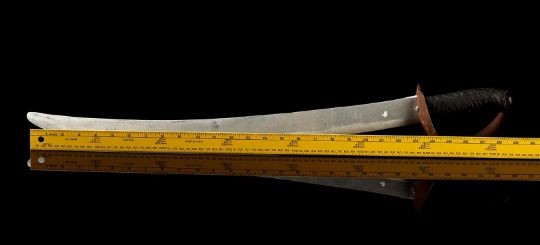 A Fratelli cutlass from Richard Donner’s action-adventure film The Goonies. After capturing the Goonies, Agatha (Anne Ramsey) and her two sons used pirate cutlass swords to force Andy (Kerri Green) to walk the plank from One-Eyed Willy's ship, the Inferno. This particular sword was used during the rehearsal of a cut fight sequence in which Sloth (John Matuszak) comes to the rescue and fights Jake Fratelli (Robert Davi).The sword features a curved, dulled aluminium blade and cupped guard, with a black, tape-wrapped grip. This prop weapon shows minor wear due to production use and age, but remains in very good condition. Dimensions: 76 cm x 11 cm x 10 cm (30" x 4 ½" x 4") VAT Status - OMEGA TRIANGLE