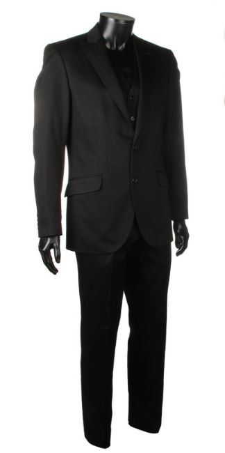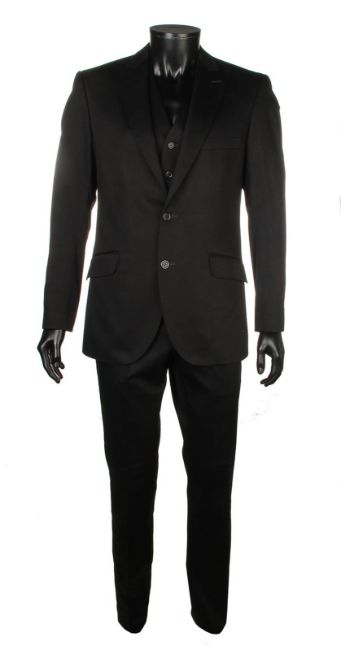 Suits worn by Agent 47 (Rupert Friend) and John Smith (Zachary Quinto) in the game-based action thriller Hitman: Agent 47. Agent 47 wore his signature black suit throughout the film, whilst Smith wore his grey suit during the latter part of the movie as he hunted down47 and Katia (Hannah Ware). The black three-piece suit belonging to Agent 47 has 'AG 47, Rupert Friend' handwritten inside the jacket and trousers, with Smith’s grey suit labelled 'Zack Stunt, Zacharias De Quinto(sic)' and 'John Stund (sic)'inside the jacket and 'Zacharias De Quinto(sic)' inside the trousers. There is also a costume tag written in Spanish. Both remain in very good condition. VAT Status - DAGGER