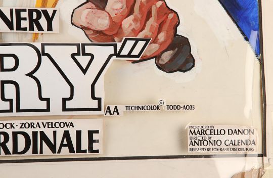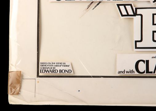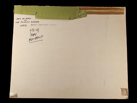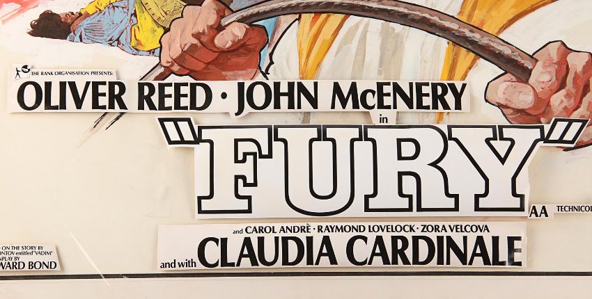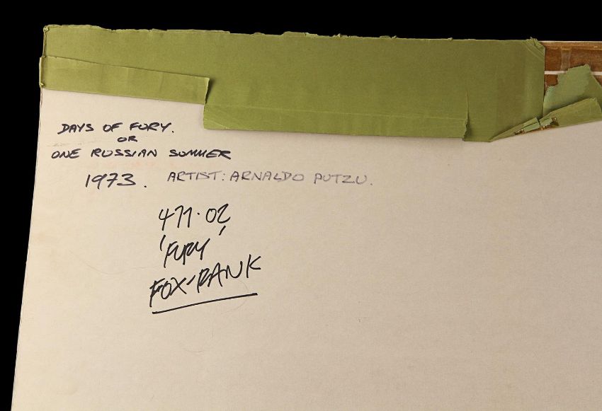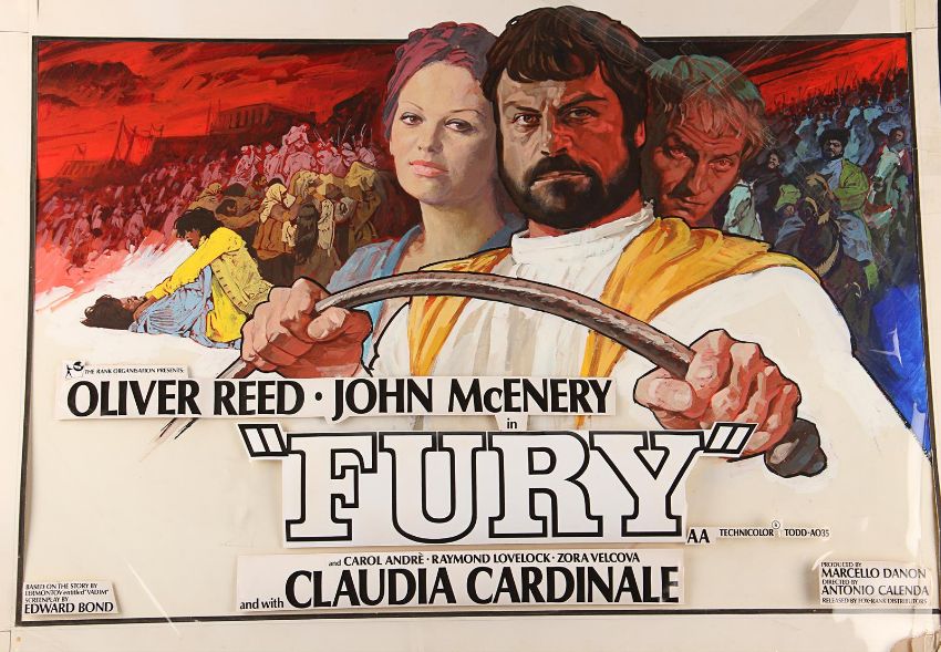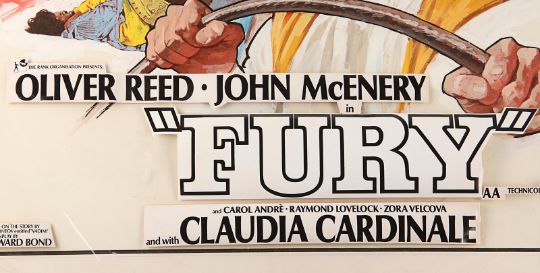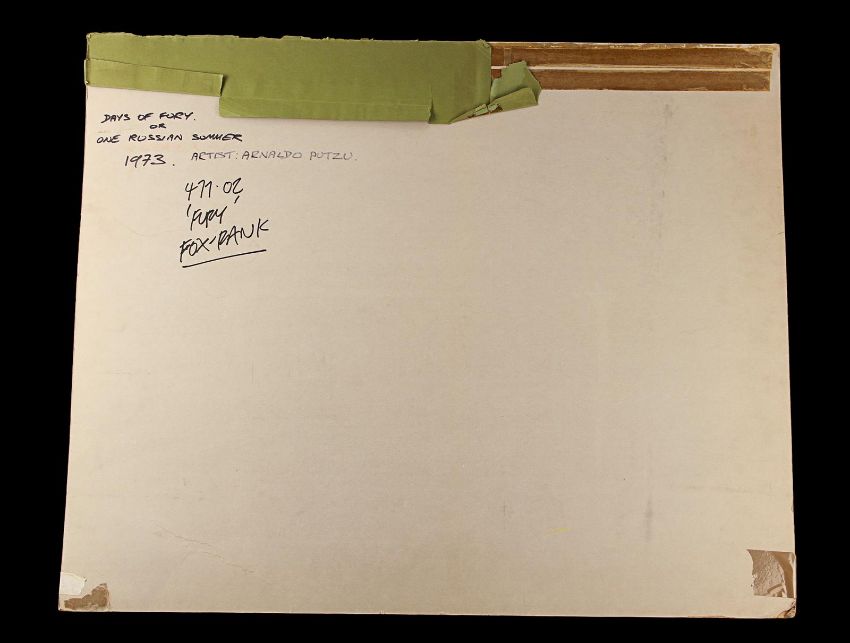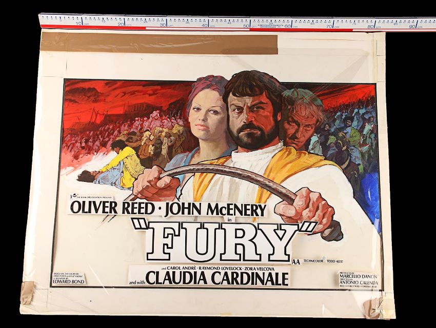 Hand-painted UK quad poster artwork for Antonio Calenda’s Anglo-Italianepic Fury (also known as One Russian Summer in the UK). Created by artist Arnaldo Putzu, the piece is rendered in gouache on illustration board and features the characters Palizyn (Oliver Reed), Anya (Claudia Cardinale) and Vadim (John McEnery), with images of the suppressed serfs in the background. A clear plastic overlay attached to the board shows the intended placement of poster titles and credits. The artwork displays some wear to the board and creases and tears to the overlay from use, storage and age. Dimensions: 68 cm x 82.5 cm x 1 cm (26 ¾" x 32 ½" x ½") Please note this lot is sold without copyright, reproduction rights, licensing agreements or any other type of legal release. VAT Status - Margin