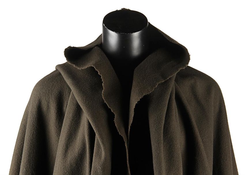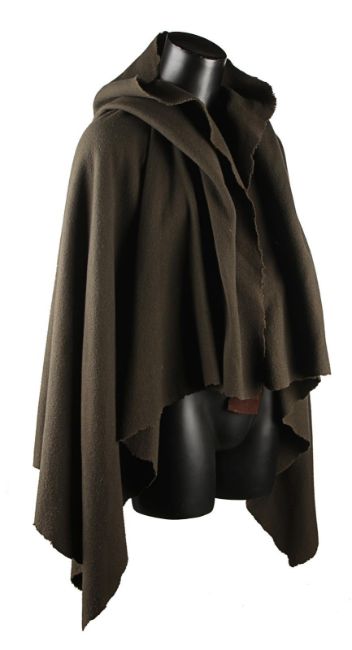 Balian de Ibelin's (Orlando Bloom) cloak from Ridley Scott’s historical epic Kingdom of Heaven. Balian wore his brown cloak in early scenes, most notably after fleeing his village after murdering his half-brother (Michael Sheen) in a fit of rage. The cloak is made from brown, woollen material and features a pointed hood and ragged hem. It has two brown, faux-leather straps on the inside to secure the cloak to the actor. An Angels Costumiers label is located in the collar reading 'Kingdom of Heaven, Orlando Bloom'. Intentionally distressed for the production, the piece remains in excellent condition. VAT Status - DAGGER