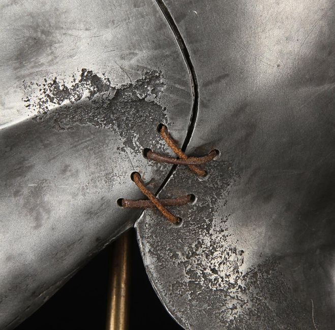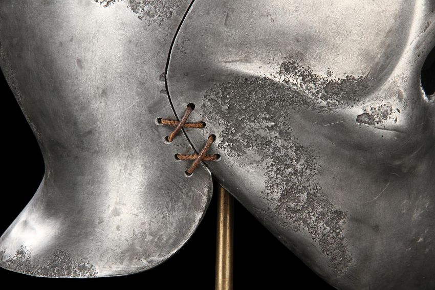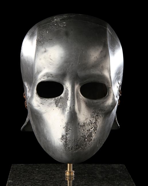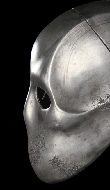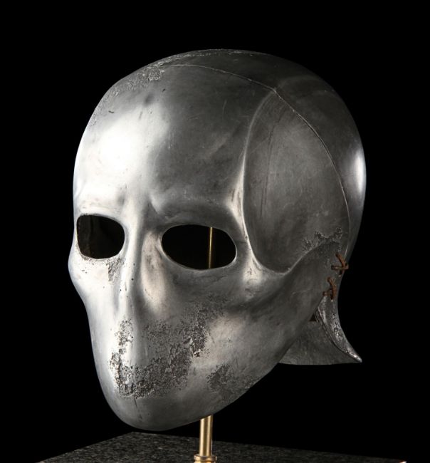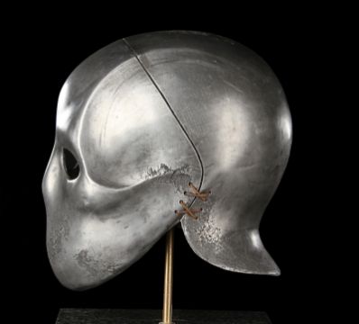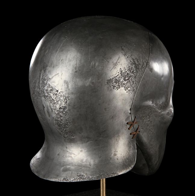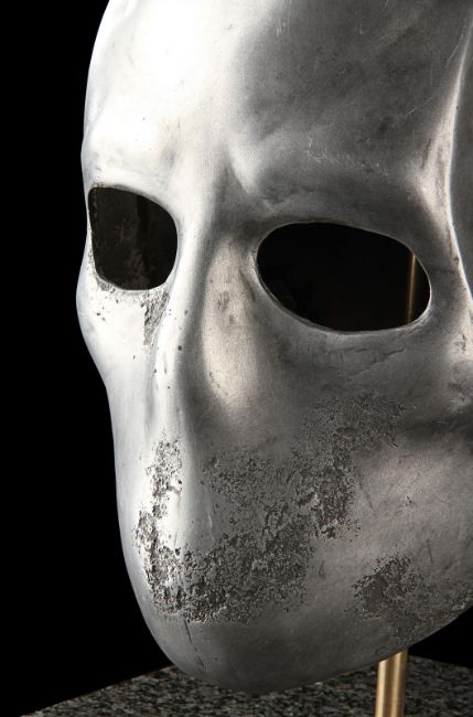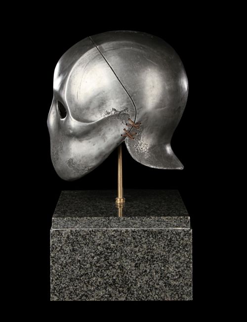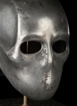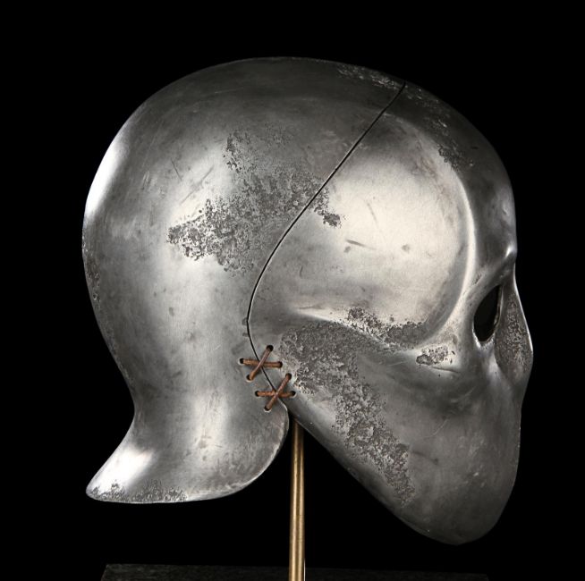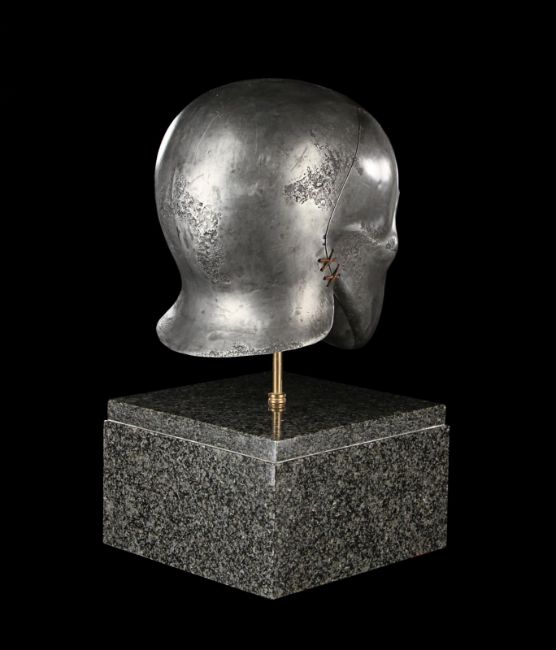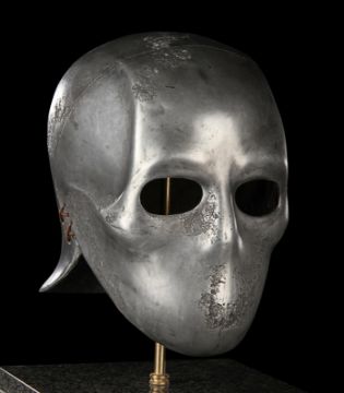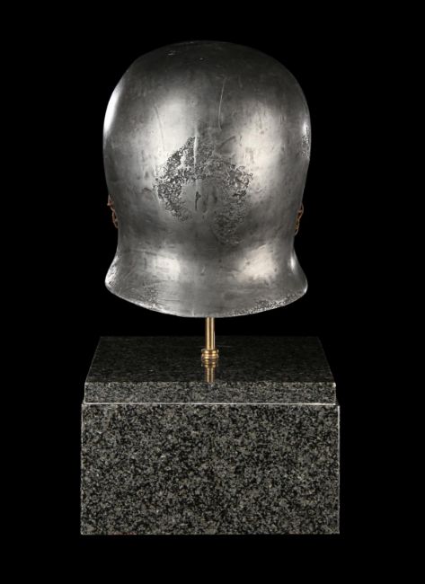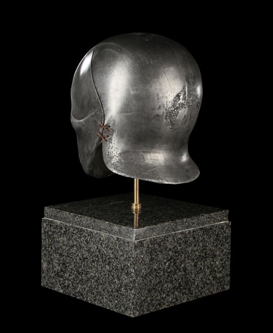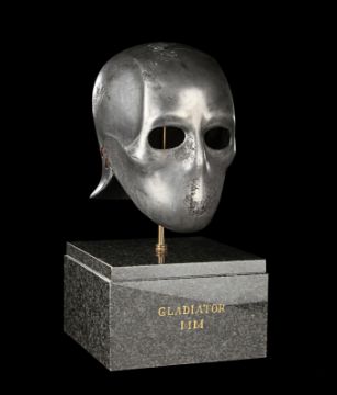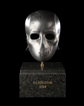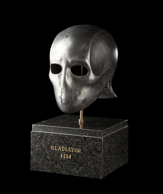 A Skeletorious gladiator helmet from Ridley Scott’s Oscar®-winning action epic Gladiator. Two Skeletorious gladiators fought in their helmets during the first and second battles featuring Maximus (Russell Crowe) in the arena in Zucchabar. The helmet was gifted by Ridley Scott to one of the film department heads when production wrapped. Designed by Janty Yates, who won an Oscar for her costume design on Gladiator, the piece is made from fibreglass impregnated with metal powder to replicate the appearance of forged steel. The helmet is intentionally distressed to look worn from its time in the arena, with battle scars and pitting on the front and back. The helmet has brown leather lace detailing on both sides. The inside is lined with foam covered with brown leather for comfort. It is displayed on a marble base with "GladiatorMM" inscribed in faux-gold paint. Dimensions (displayed): 26 cm x 26 cm x 47 cm (10 ¼" x 10 ¼" x 18 ½") VAT Status - Margin