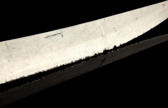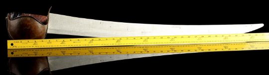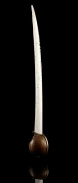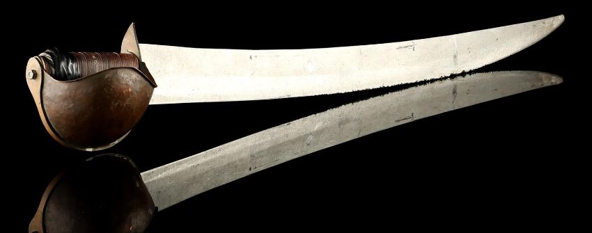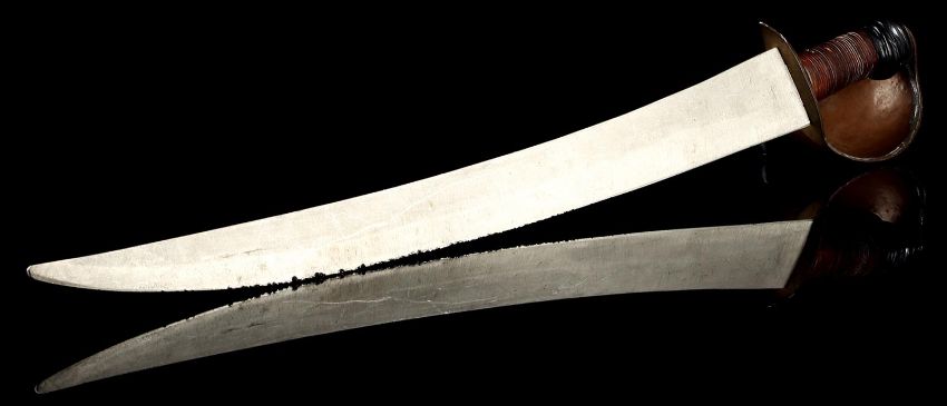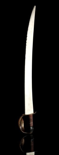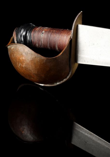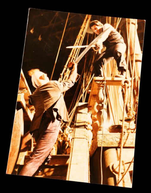 One-Eyed Willy's cutlass from Richard Donner’s action-adventure film The Goonies. Made for the production but ultimately not seen on screen, One Eyed Willy’s sword was intended to be used by Sloth (John Matuszak) in a daring rescue on board One-Eyed Willy's ship, the Inferno. The piece was used by Sloth's stunt double, Randell Dennis Widner, during rehearsals for the unrealised sequence in which Sloth duelled with Jake Fratelli (Robert Davi) as the Goonies escaped to safety. The sword features a curved aluminium blade and cupped guard, with a leather, cord-wrapped grip. The blade displays numerous dents on the edge from combat use and from repeatedly breaking the swords used by the Fratellis, one of the contributing factors to the scene being scrapped. The handle shows black tape wrapped around the base of the grip. Included with this item is a behind-the-scenes photograph showing the sword in use during the fight rehearsal. The prop weapon shows minor wear due to production use and age, but remains in very good condition. Dimensions: 99 cm x 13 cm x 15 cm (39" x 5" x 6") VAT Status - OMEGA TRIANGLE