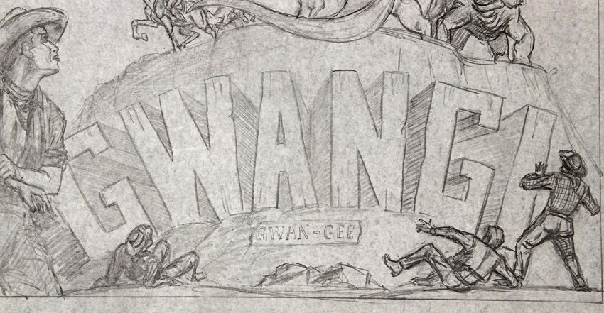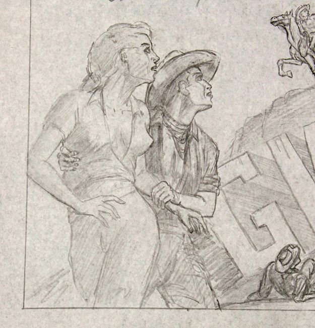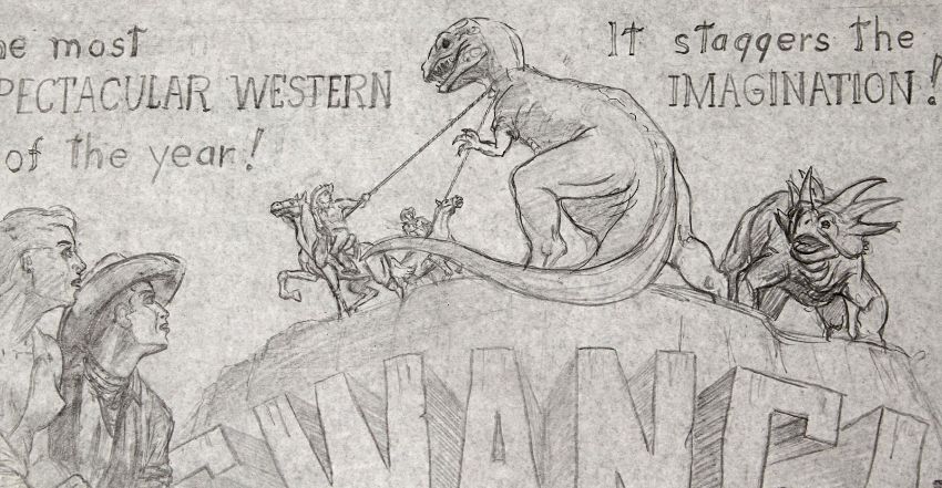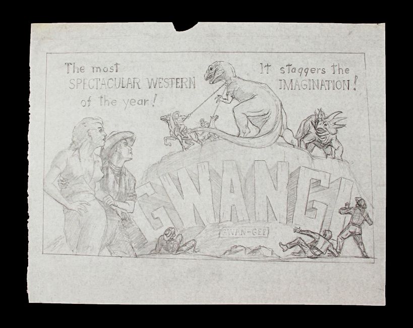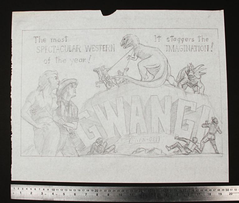 A hand-drawn sketch for a poster design for Jim O’Connolly’s sci-fi western The Valley of the Gwangi. This image shows Tuck (James Franciscus) and T.J. (Gila Golan) looking at the film’s most memorable scene, the T-Rex being lassoed. Harryhausen would often create an idea for a movie poster as part of his process, as it helped him refine the essence of the film. This sketch is drawn in pencil on white paper. One side has a rough edge and there is a small section missing to the top edge, which does not affect the main image. Otherwise, the artwork remains in very good condition. Dimensions: 40 cm x 50 cm (15 ¾ " x 19 ¾")The final, key art version of this image features on page 204 of Ray Harryhausen An Animated Life by Ray Harryhausen and Tony Dalton, published by Aurum. Please note this lot is sold without copyright, reproduction rights, licensing agreements or any other type of legal release. VAT Status - Margin TRIANGLE