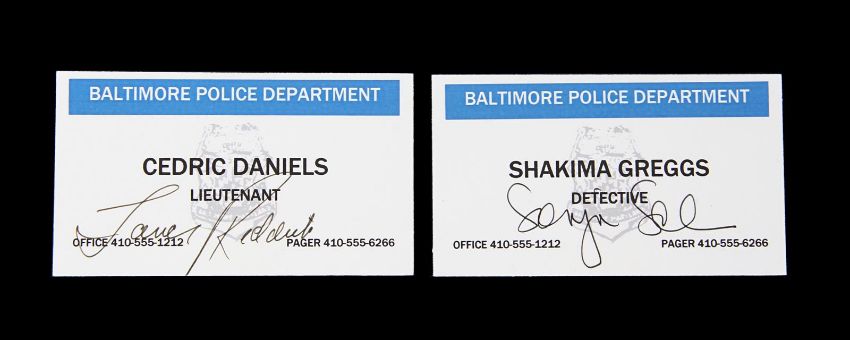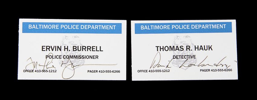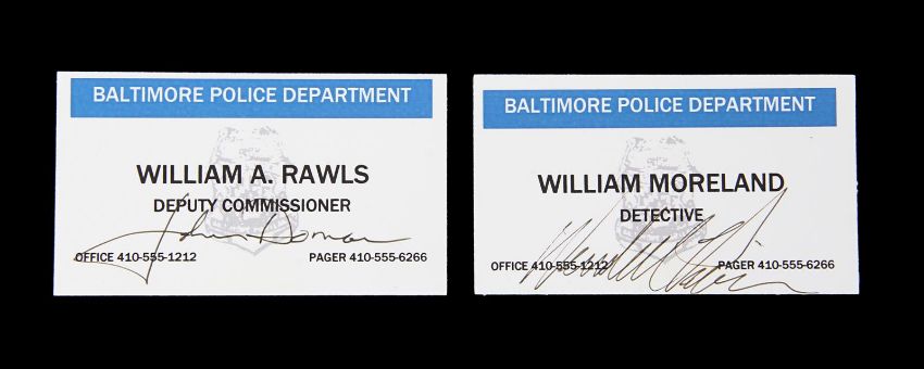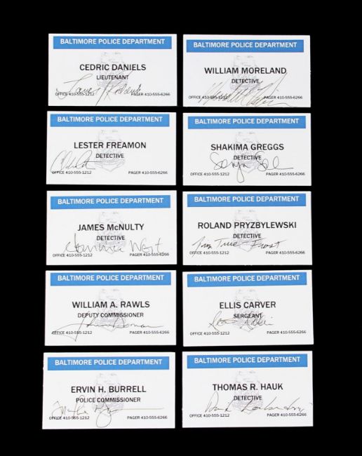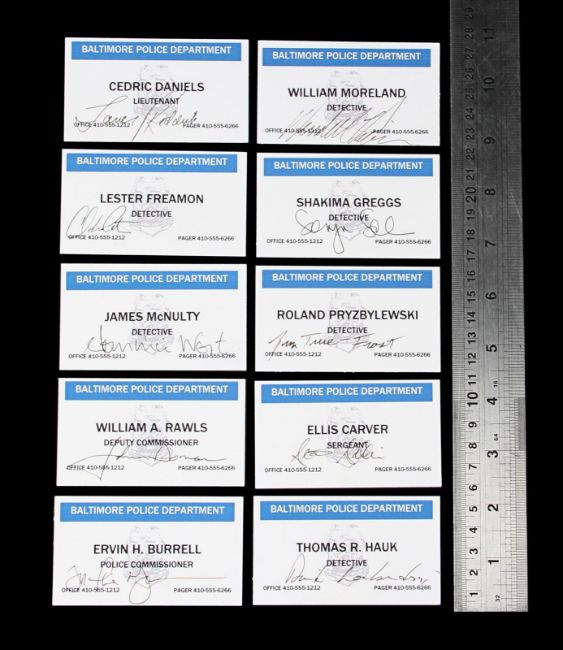 A collection of ten key character business cards autographed by the cast from the acclaimed HBO TV series The Wire. The members of the Baltimore Police Department used their business cards in various episodes during the show's run. Each card is printed on thin-weight white stock, with the police department name across the top, character name, position and contact numbers, each signed in black ink across the bottom. Autographs include Dominic West, John Doman and Wendell Pierce. There are sticker remnants on the reverse of each card from being previously displayed. Dimensions (each): 9 cm x 5cm (3.5" x 2") VAT Status - Margin TRIANGLE