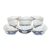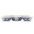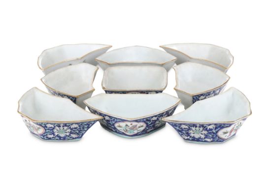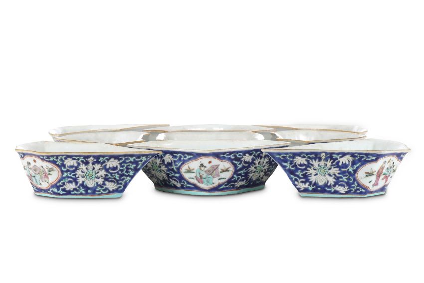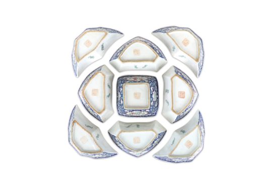 Eight triangular dishes arranged around a central square bowl, each painted with stylised lotus flower heads and foliage and panels with figures on a dark blue ground, 5cm H, 13-20cm diameter. (9)