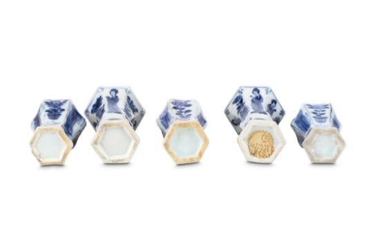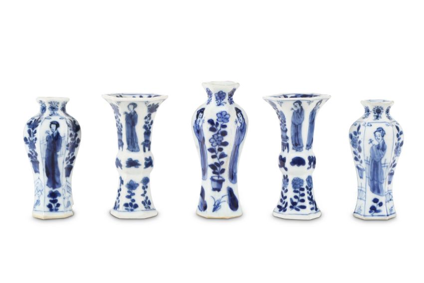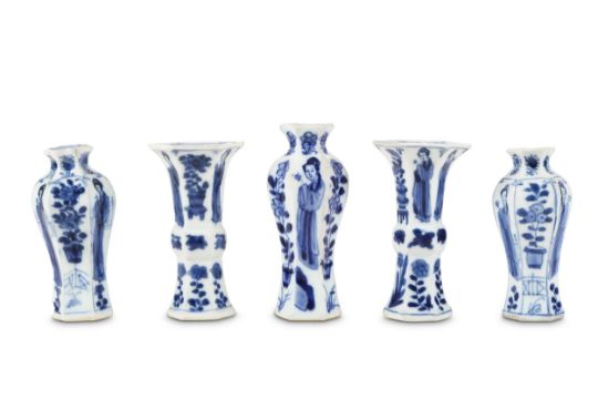 Comprising: three baluster and two gu-shaped vases, all with hexagonal-section bodies painted with alternating panels of ladies and floral sprays, 9.7cm H. (5)