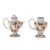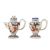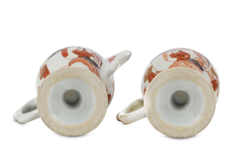 Each with an ovoid, flared body and a broad foot, painted in enamels and gilt with figures near trees and rocks, with floral bands to the shoulder and foot, the ewer with a pointed spout, 14cm H. (4)