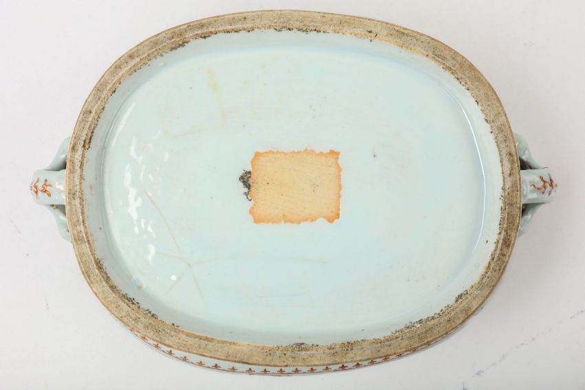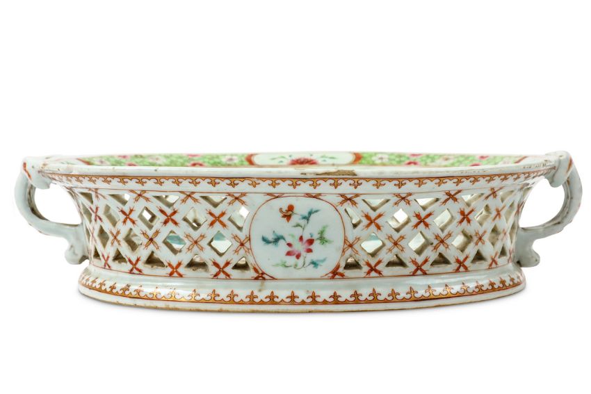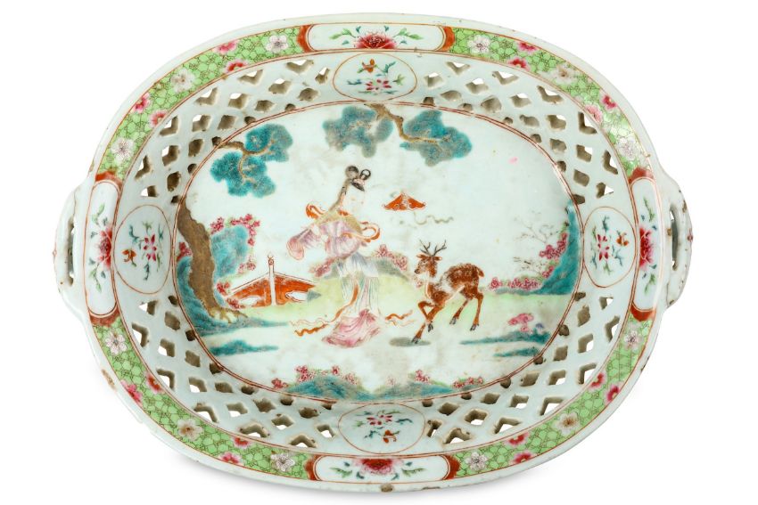 The basket of oval section with deep everted pierced sides set with a handle on either side of the rim, the interior painted with a lady with a deer beneath a pine tree on a garden veranda, within a border of floral panels, with an ice crackle prunus band to the rim, 7 x 22 x 31cm.