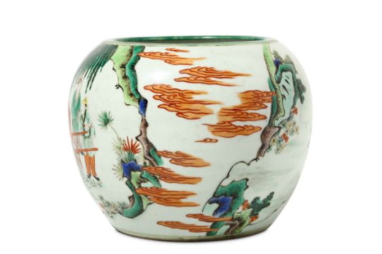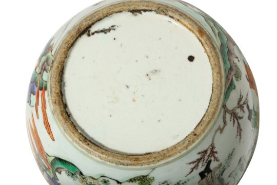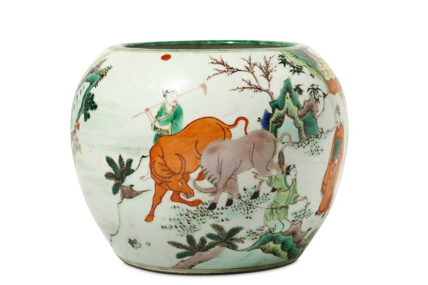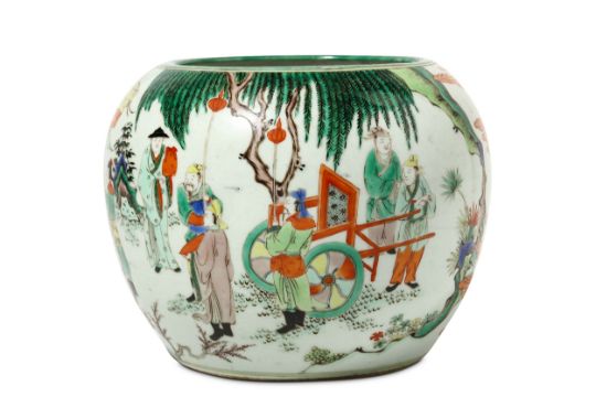 The tapered ovoid body rising to an incurved mouth, decorated around the exterior with a continuous figurative scene, 17cm H.