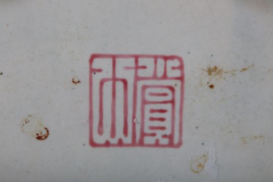 Painted to the interior with three figures in a fenced garden within a floral border, the reverse with dragons to the sides and the base with a two character seal, 12cm long.