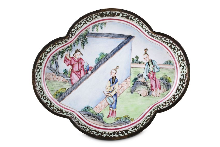清十九世紀   廣東銅胎繪琺瑯四葉形人物園景圖托盤,「賞心」款