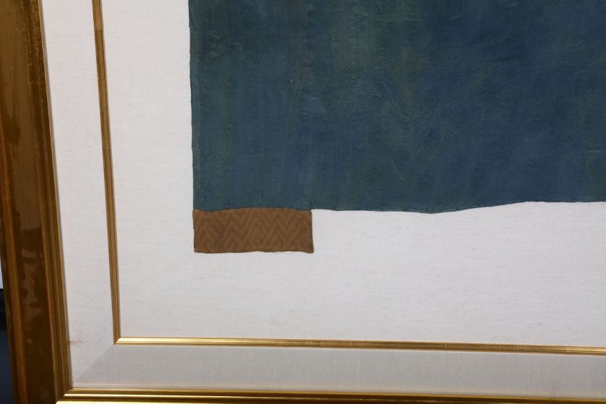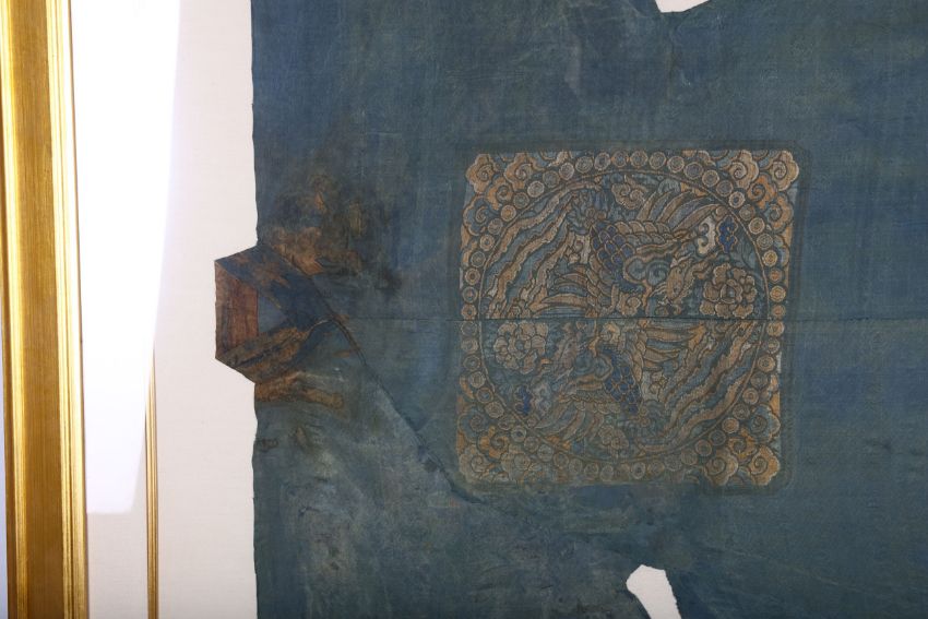 The gown with a rank badge to the centre woven with a pair of phoenixes, framed and glazed, 80 x 40cm.