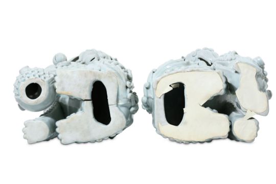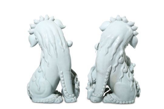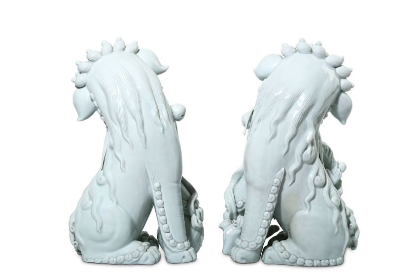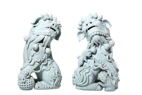 Finely modelled, seated, facing opposite directions, each with an open mouth lined with fangs and a collar with bells around the neck, the head with curly mane, brow and beard, the male with a brocade ball, the female with two puppies, 36cm H. (2)