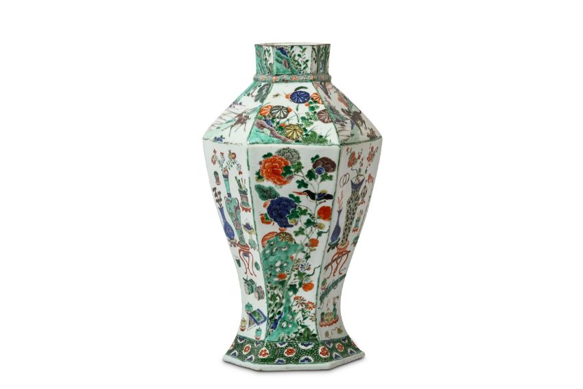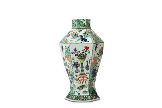 A CHINESE FAMILLE VERTE HEXAGONAL VASE.