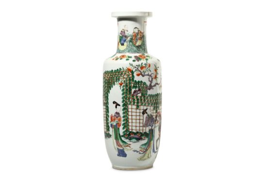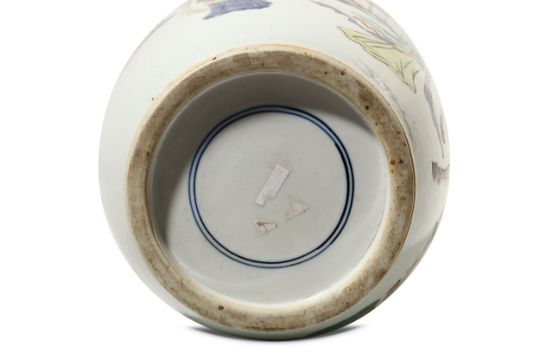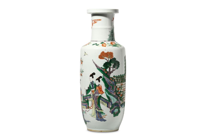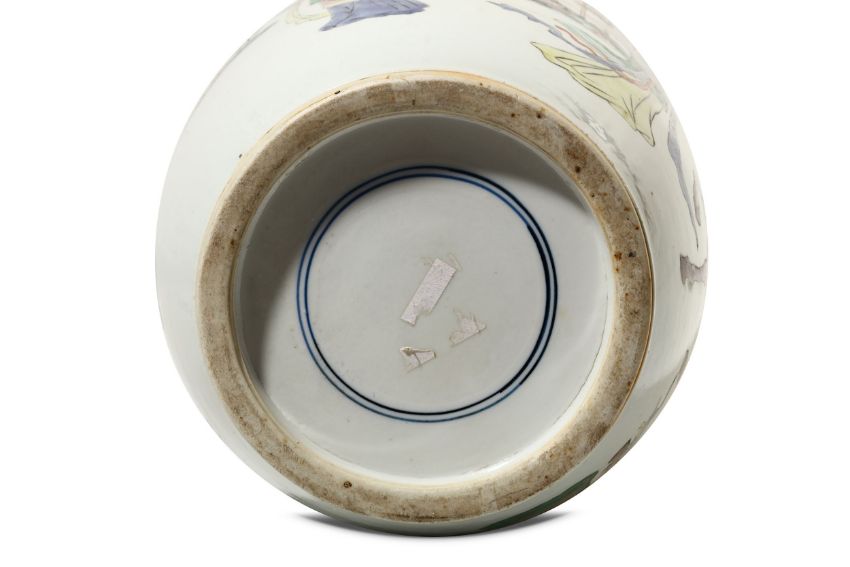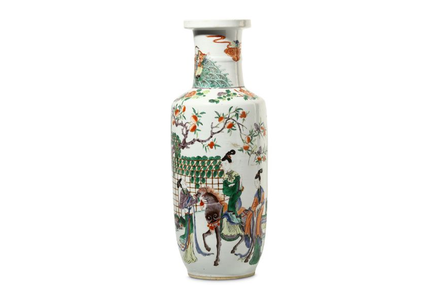 Painted with an equestrian lady and her attendants near a garden arcade and a fruiting peach tree, the neck with the Immortals Li Tieguai with his gourd and Liu Hai with the , both against stylised waves near a pavilion shrouded in red clouds, with sprays of blossoms to the shoulder, 61cm H.