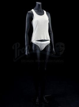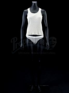 The costume includes a light grey rib-knit cotton tank top and grey briefs with a white elastic waistband. Both pieces exhibit subtle discolouration and some minor fabric pilling in the briefs.