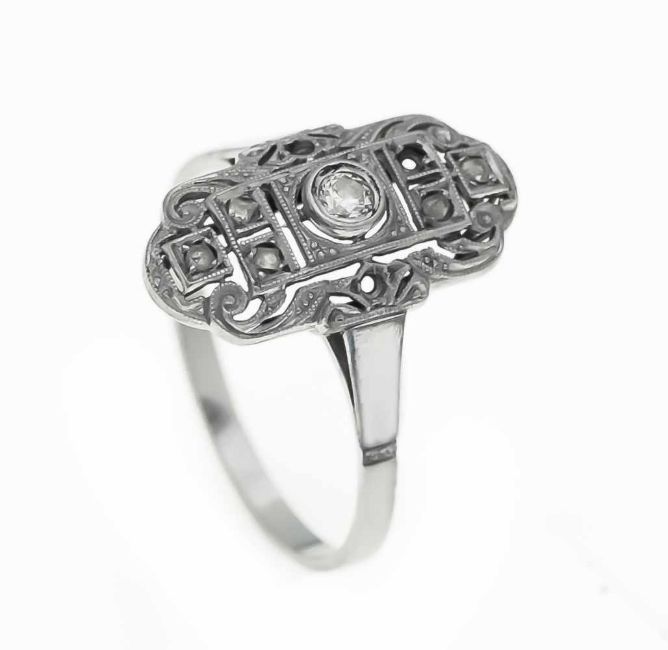 Art Deco ring WG 585/000 with an old cut diamond 0.07 ct W / VS and diamond roses (3