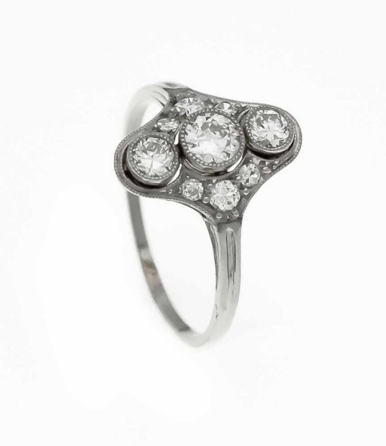 Art Deco ring WG 750/000 with 9 old cut diamonds, total 0.72 ct TW-W / VS-SI, RG 56, 2.5 g
