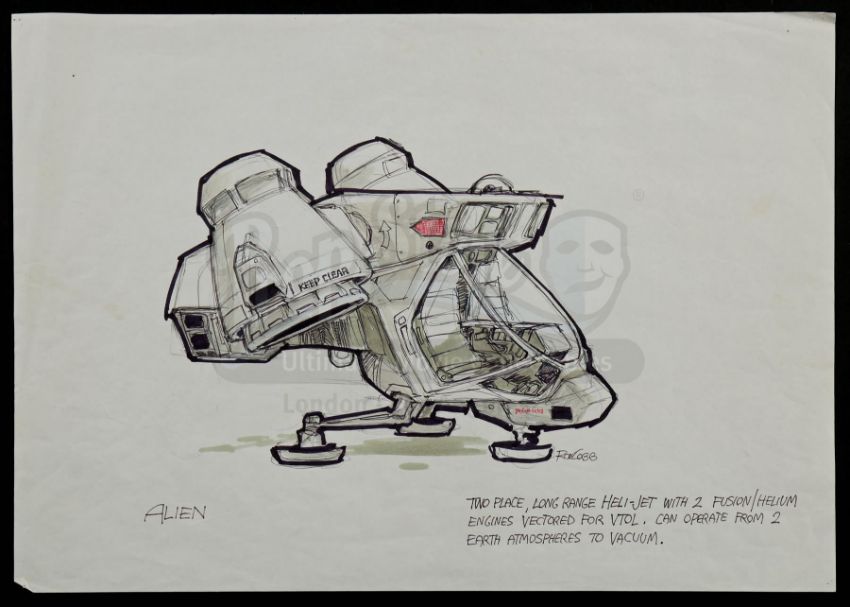 A hand-drawn Ron Cobb Nostromo heli-jet concept sketch from the production of Ridley Scott's sci-fi horror film Alien. The crew of the Weyland-Yutani Corporation's USCSS Nostromo were awakened from hyper-sleep by a distress signal from a desolate moon.
